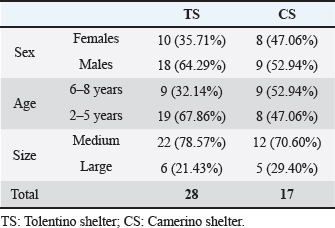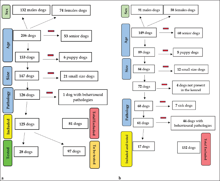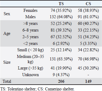 Blood group typing was carried out on blood with EDTA by rapid immunochromatographic test (Lab Test BT DEA1®-Alvedia®). CBC evaluation were performed on samples with K3 EDTA anticoagulant with the Procyte® IDEXX analyzer and a blood smear test was carried out. Evaluated parameters included: red blood cell (RBC); hematocrit (HCT); hemoglobin (Hb); mean corpuscular volume (MCV); mean corpuscular Hb (MCH); MCH concentration (MCHC); red distribution width (RDW); % reticulocytes; reticulocyte Hb (Retic-Hb); Leukocytes; % segmented neutrophils; % lymphocytes; % monocytes; % eosinophils; % basophils; absolute value of segmented neutrophils, lymphocytes, monocytes, eosinophils, and basophils; platelets (PLT); PLT distribution width (PDW); mean PLT volume (MPV); Plateletcrit. Serum was obtained using the Rotina 46R of Hettich Zentrifugen® centrifuge and then analyzed using the machine BT3500 Vet of Biotecnica Instruments®. The biochemical profile took into account the following parameters: Calcium (Ca; Arsenazio III); Blood urea nitrogen (ultra violet-U.V. method); Gamma-glutamide transferase (GGT; IFCC-International Federation of Clinical Chemistry method); Alkaline phosphatase (ALP; DEA-diethanolamine method); Glucose (Glu; Trinder method); Creatinine (Jaffè method); glutamic-oxalacetic transaminase (GOT; IFCC method); Alanine amino-transferase (GPT; IFCC method); cholesterol (Trinder method); Triglycerides (Trinder method); albumin (Alb; VBC-Bromocresol Green method); Phosphorus (U.V.-Ultra Violet method); Direct bilirubin (Sulfanilic method); Total Bilirubin (sulfanilic method); indirect bilirubin; total proteins (TP; biuret method); Albumin/globulin ratio; corrected calcium; Calcium/phosphorus ratio; globulins. The separated serum samples were employed for hemoparasitoses testing, as required by the Ministerial Guideline on Veterinary Transfusion Medicine. The SNAP® Test 4Dx® Plus (IDEXX) and the SNAP® Leishmania Tests were used for the control of Ehrlichiosis, Anaplasmosis, Borreliosis and Heartworm Disease, and Leishmaniasis. For the latter, dogs had already been tested with indirect immunofluorence according to the Marche region surveillance plan for the control of Leishmaniasis. In the case of Babesiosis and Brucellosis, testing was sporadically carried out on a random selection of the specimens. The smear test was used to exclude the presence of Babesia canis, while Canine Brucellosis Antibody Test Kit D-TEC® CB (Zoetis) for Brucella canis. Stool examination by flotation test was performed twice a year on random samples. Data processingMicrosoft® Excel® program for Microsoft 365 MSO (Version 2201 Build 16.0.14827.20180) was used to make the statistical part. The functions used were: sum, mean, median, standard deviation, and percentage. Ethical approvalNot needed for this study. ResultsDogs’ populationsIn 2021, the TS accommodated 206 dogs and CS hosted 149 dogs. Table 2 illustrates the demographic composition of these populations, focusing on the distribution and percentage of sex, age, and size across both shelters. Notably, both shelters exhibited a higher percentage of male dogs [TS=64.08%; CS=61.07%] compared to females [TS=35.92%; CS=38.93%]. A significant majority (approximately 80%) of the dogs were of medium-large size (weighing over 25 kg). The sum of the percentages of medium-large breed dogs in TS was 83.49% while in CS 77.18%. While specific breeds were not identifiable, there was a notable prevalence of mixed breeds. These mixed breeds predominantly displayed characteristics akin to Maremmano shepherds and hound breeds. Figure 1 presents two flow diagrams that describe the criteria for the progressive exclusion of dogs, as outlined in the Ministerial Guideline on Veterinary Transfusion Medicine. Each diagram begins with the total population of the respective shelter, starting with the total consistency of the populations, categorized by sex. On the left side of the diagram, selection criteria (age, size, and pathologies) are delineated. Some dogs considered suitable for collection in the preliminary phase, once physically contained outside or inside the box, proved not to be able to sustain too close contact with the operators, not maintaining their well-being and tranquillity, which is why they did not return to the chosen population. Concerning CS, most of the dogs with behavioural pathologies resulted to be phobic, unpredictable or unruly. The pathologies found in the preliminary phase of the dogs’ clinical history were leishmaniasis, heart disease, paraplegia, and hypothyroidism. The selection criteria are used to identify and exclude unsuitable candidates, which are shown on the right side of the diagram. The process concludes with the final counts: the total number of dogs included in and excluded in the study, along with the count of specimens that were effectively tested. Out of the TS population, one hundred and twenty-five dogs (60.68%) were potential candidates for this study based on the Ministerial guideline on Veterinary Transfusion Medicine criteria, yet only twenty-eight underwent blood testing due to the COVID-19 pandemic situation and, later, the continuous changing of the population. In the case of CS, all one hundred and forty-nine dogs in the population were evaluated based on the anamnestic and/or clinical records, with only seventeen selected for the study because they met the criteria to become possible blood donors. Most of the excluded dogs exhibited behavioural pathologies or temperament issues, making them ineligible for donation, as opposed to clinical and organic diseases. Table 2. Description of total shelter populations and their main characteristics.