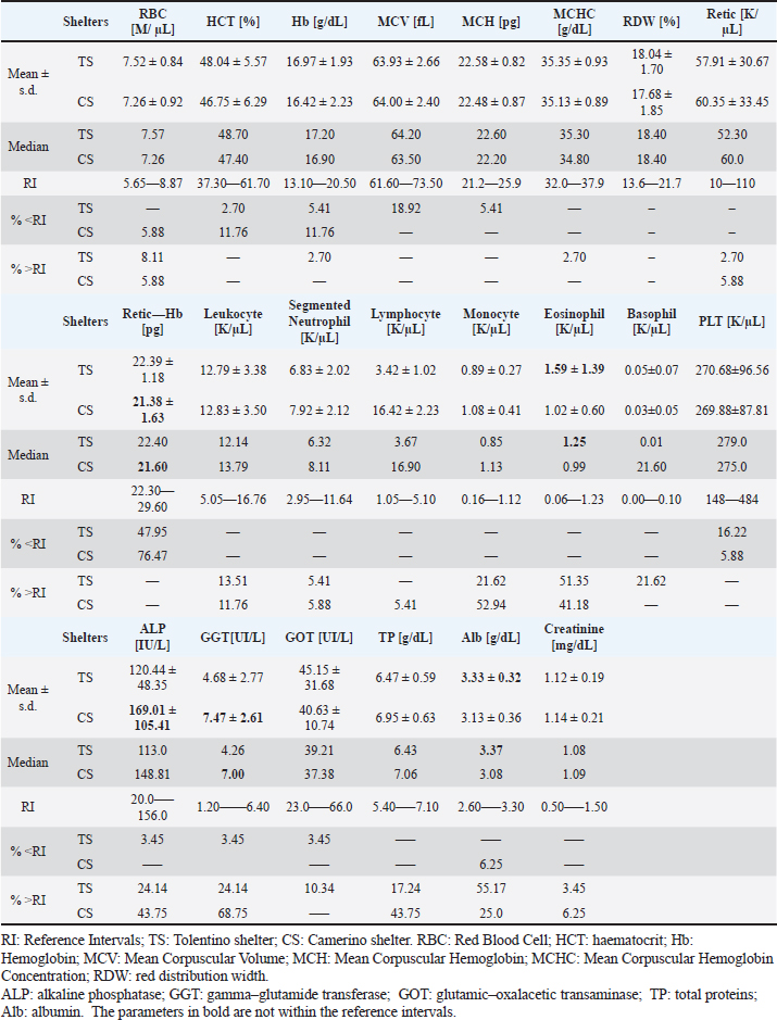 ABSTRACTBackground: In recent years, the field of transfusion medicine for dogs has advanced significantly, becoming a crucial aspect of veterinary clinical practice. Nowadays, blood still remains a fundamental biological source and the welfare and health status of eligible species-specific blood donors are essential for veterinary transfusion medicine. Aim: This study focused on evaluating two shelters in Central Italy (Marche region), located in Tolentino (TS) and in Camerino (CS), in order to assess the potential of the shelter dogs as canine blood donors. Methods: We evaluated a total of 45 dogs from these shelters based on physical (age and size), clinical, behavioural, and blood analysis criteria described in the Italian Ministerial Guideline for Veterinary Transfusion Medicine (2016). Results: At the TS shelter, out of 206 resident dogs, 125 met the donation criteria (60.68%), with 28 (13.59%) selected for the study due to the impossibility to collect the samplings or other exclusion causes. In the CS shelter, of the 149 dogs, 17 (11.41%) were identified as potential blood donors and included in the study. Among these, seven dogs (25%) from TS and five dogs (29.41%) from CS were found to have DEA1 negative blood group. High percentages (TS=25.24%, CS=40.27%) of dogs were excluded for seniority and 29.53% in CS for behavioural issues. Notable findings included reduced erythrocyte mean corpuscular volume [mean TS=63.93 fl; CS=64.00 fl] and Reticulocyte Hemoglobin [mean TS=22.39 pg; CS=21.38 pg]. Additionally, in both shelters’ dogs showed a modest increase in eosinophils levels [mean TS=1.59 K/μl; CS=1.02 K/μl]. Conclusion: Shelter dogs can fulfill the blood donation requirements set by the Italian Ministerial Guideline on Veterinary Transfusion Medicine. They are generally in good health and present a low risk of transmitting parasitic diseases; however, many are ineligible for donation due to behavioural pathologies or temperament issues and seniority. Keywords: Dog, Transfusion medicine, Guideline, Blood donor, Shelter. IntroductionTransfusion medicine in veterinary medicine is an expanding field, offering new opportunities for development, research, and applications. Its global adoption in recent years has led various countries to establish diverse regulatory frameworks. For instance, the American College of Veterinary Internal Medicine (ACVIM) in the United States issued the consensus statement in 2005 (Wardrop et al., 2005), then updated in 2016 (Wardrop et al., 2016), addressing the testing for infectious diseases in canine and feline blood donors. These laboratory tests, including blood type identification, crossmatching tests, and pathogen screening are essential to increase the safety of blood donation. They help monitor the donor’s health, reduce post-transfusion adverse reactions in recipients, and minimize the risk of vector-borne diseases (Reine, 2004; Wardrop et al, 2023). In Italy, the 2016 Ministerial Guideline on Veterinary Transfusion Medicine sets out detailed criteria for selecting donor animals (dogs, cats, and horses). It covers eligibility, exclusion standards, required blood tests, and procedures for collecting and storing blood. For example, donor dogs should weigh over 25 kg, be aged between 2 and 8 years, be docile, clinically healthy, regularly vaccinated, and undergo regular prophylaxis against heartworm, ectoparasite, and endoparasite. Blood donor animals must be healthy and constantly monitored. This approach, not only supports preventive medicine, but also allows for ongoing health monitoring of the animals and tracking of epidemiological infectious disease trends (Morganti et al., 2022). This is particularly pertinent in shelter environments, where managing individual health and controlling infectious diseases can be more challenging, from the perspective of preventive medicine (Mutinelli et al., 2013). Given this context, our study aimed to explore the feasibility of using shelter dogs in central Italy as blood donors. Historically, this has never been pursued due to unknown clinical and transfusion histories of shelter dogs and potential ethical concerns (Yagi and Bean, 2016). Currently, specific blood donation programs for dog shelters are absent, yet they could be viable candidates for transfusion medicine practices, provided their physical well-being is maintained and ethical considerations are respected (DeLuca et al, 2006; Mutinelli et al., 2013). Additionally, canine blood donation could foster awareness of transfusion practices and encourage blood donation among dog owners and, by extension, in humans (Ashall et al, 2017; Wilder and Humm, 2019). In 2012, the Marche region implemented a surveillance plan for Leishmaniasis control, as it is an endemic area for this protozoan infection (Surveillance Plan, 2012). Blood samples for this study were collected as part of this regional plan (“Regional law”), with authorization from the respective shelter managers. Marche Region is a territory of Central Italy fronting on the Adriatic Sea and comprises five provinces; in the eastern part is bathed by the Adriatic Sea, the Umbrian-Marchigian section of the Apennines serves as its mountain backbone and it is mainly characterized by hills [Website Britannica.com]. This preliminary study is the first of its kind in the region, aiming to assess the suitability of shelter dogs as blood donors, considering their health status and the potential to contribute to transfusion medicine. Materials and MethodsBlood samples were collected during the 2020–2021 years from two shelters in Central Italy-Marche Region: “Monti Azzurri” in Tolentino and “Colle Altino” in Camerino, located in the mountain area of the region. A manager and an official veterinarian are present in both shelters. In these shelters, dogs are divided by fences, single or with more individuals, with indoor kennels and material for heating, bowls and a stool in front. At least 