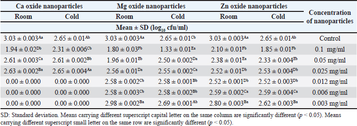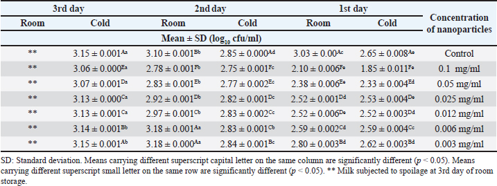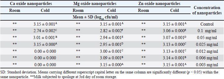 Table 3. Impact of different concentrations of various nanoparticles on viability of E. coli inoculated in UHT milk stored at (4˚C ± 1˚C) and (25˚C ± 1˚C) on the 2nd day.
