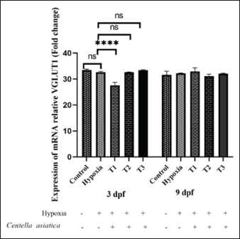 Fig. 2. VGLUT1 expression of embryonic zebrafish at 3, and 9 dpf in the CA treatment groups under OD conditions. There was no significant difference in VGLUT1 gene expression with the timing of CA administration (ages 3 dpf and 9 dpf), and an interaction occurred between the treatment and the timing of CA administration (p > 0.05). A significant difference in VGLUT1 gene expression was caused by the concentration of CA treatment (p < 0.05). The administration of CA at a concentration of 2.5 μg/ml. **** (p < 0.0001) dan ns (not significance). According to the One-way ANOVA, no significant difference existed between treatment groups in 9 dpf zebrafish larvae (p > 0.05). The control group (31.61) exhibited a significant difference compared to the hypoxia group (32.23). The administration of CA in OD conditions in zebrafish larvae showed a tendency for decreased average VGLUT expression in groups T2 (31.19) and T3 (32.08), and an increase in T1 (32.95) compared to the group without CA. DiscussionZebrafish have become a crucial model organism for studying hypoxic conditions due to their external fertilization, small size, rapid development, high reproductive output, and transparent larval bodies, facilitating easy observation (Üstündağ et al., 2019). Under OD conditions, oxygen diffusion from the gills to the blood is impaired, affecting respiratory efficiency (Pelster, 2021). In hypoxic conditions, zebrafish undergo a metabolic shift from aerobic to anaerobic processes, resulting in less efficient energy production and the generation of byproducts like lactic acid (Barrionuevo et al., 2010), which can lead to cellular damage. This change impacts the cells’ ability to synthesize proteins, including the BDNF. Oxygen deficiency can lead to oxidative stress, where there is an increase in the production of free radicals (Blokhina, 2003), potentially causing damage to cells and tissues, as well as affecting cellular structures and functions, including protein synthesis (Pizzino et al., 2017). CA administration was observed up to 9 dpf in this study. This is relevant considering the formation of yolk in zebrafish larvae begins between 8 and 10 hpf. The survival rate of embryos decreases drastically in the first 24 hours. It remains constant up to 72 hpf, followed by a decline at 96 hpf, suggesting that the extract causes early life-stage mortality (Tran et al., 2023). The neuroprotective role of CA can be observed in the expression of BDNF and VGLUT1. BDNF expression in the zebrafish embryo under oxygen-deficientHypoxia may cause disruptions in neuronal function, leading to a decrease in BDNF production. BDNF plays a role in various physiological processes such as neural development, synaptic plasticity, neurogenesis, nerve protection, learning, memory (Lucini et al., 2018), and mood regulation through its interaction with the tropomyosin receptor kinase B (TrkB). When BDNF binds to TrkB receptors, it activates three intracellular signaling pathways: ERK, PI3K/Akt, and phospholipase Cγ (PLCγ), which are crucial for mediating BDNF’s diverse functions (Correia et al., 2023). Research findings suggest that BDNF expression in healthy (control) zebrafish larvae is higher than in hypoxic conditions. Hypoxia in zebrafish larvae leads to decreased BDNF expression, aligning with the findings of Ariani et al., (2023b), which indicate that asiatic acid in CA can increase BDNF in intermittent OD conditions. Hypoxia can influence the expression of genes regulating BDNF production, such as the transcription factor hypoxia-inducible factor (HIF), which is activated by OD (Fuhrmann and Brüne, 2017). Mitochondrial dysfunction likely reduces the cell’s ability to synthesize BDNF, making it difficult for cells to develop, regenerate, and become more susceptible to damage (Pawlus et al., 2012). Thus, healthy conditions with adequate oxygenation support optimal neuronal function and BDNF synthesis. Administering CA at 1.25–2.5 µg/ml concentrations to zebrafish larvae increases BDNF expression. CA acts as an antioxidant against prooxidant threats entering the body. Antioxidants neutralize free radicals or oxidative stress, thereby protecting cells from damage. Oxidative stress can reduce BDNF expression, so antioxidants indirectly support the presence and function of BDNF in the brain. Hypoxia may cause disruptions in neuronal function, leading to a decrease in BDNF production. BDNF plays a role in various physiological processes such as neural development, synaptic plasticity, neurogenesis, nerve protection, learning, and memory (Shen et al., 2023). Increased BDNF in CA-treated zebrafish larvae may help maintain or enhance brain neuroplasticity and synaptic function, as well as maintain cellular integrity and BDNF function, aiding in the maintenance of plasticity (Wang et al., 2020). High BDNF expression may play a role in certain inflammatory conditions in the brain (Giacobbo et al., 2019; Porter and O’Connor, 2022). The administration of CA in zebrafish at 3 dpf did not significantly differ from that at 9 dpf in altering BDNF expression. This could be due to a stable or sufficient antioxidative capacity in zebrafish in both age groups, resulting in similar responses to antioxidants. Zebrafish at 3 and 9 dpf may have comparable levels of biological maturation (Singleman and Holtzman, 2014), enabling similar responses to antioxidants, particularly in the regulation of BDNF. VGLUT1 expression in zebrafish embryos under oxygen-deficientHypoxia influences the expression and activity of VGLUT1. Research findings indicate that oxygen-deficient increases VGLUT1 compared to healthy conditions (control group). This result is corroborated by Daniels et al., (2011), who reported that VGLUT1 levels rise in conditions of hypoxic injury, stress, methamphetamine treatment, and genetic seizure models. Oxidative stress often elevates the expression of transporters like VGLUT1 as a compensatory mechanism against damag