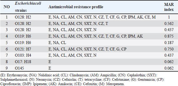 The recovered E. coli serotypes varied in their antimicrobial susceptibility as all isolates were resistant to erythromycin (100%), while showing resistance to nalidixic acid and clindamycin at 77.8% for each. The lowest resistance was recorded to cefoxitin, and meropenem at 11.1% (Table 2). Escherichia coli O28:H2 had a range for MAR index that varied from 0.437 to 1, while that of O119:H6 varied from 0.187 to 0.875, O121:H7 (0.750), O103:H4 (0.437), O17:H18 (0.062), and O145 (0.062), respectively (Table 3). Table 2. Antimicrobial susceptibility of E. coli strains.