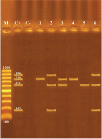 Fig. 1. Multiplex PCR of stx1 (614 bp), stx2 (779 bp), eaeA (890 bp), and hlyA (165 bp) virulence genes in the recovered E. coli isolates from camel meat, liver, and kidney. In a reduction of E. coli in the camel meat, coriander oil 1%–2% could reduce E. coli count by 24%, and 65%, respectively, with no alterations on the sensory characteristics as presented in Figure 2.
