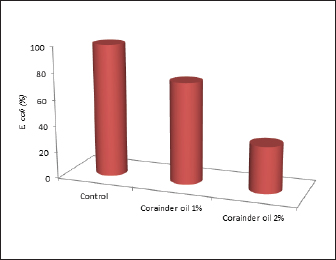 Fig. 2. Anti-E. coli effect of coriander oil. DiscussionCamel meat is an important source of animal-derived protein in several countries, particularly in the Arabian Peninsula, and Egypt. However, camel meat can be a source of foodborne pathogens. In the current study, camel meat and offal were considered as potential sources of enterotoxigenic E. coli. Likely, Tegegne et al. (2019) isolated Staphylococcus aureus and E. coli from camel meat at retail shops in Jigjiga city, Ethiopia. Other pathogens were also isolated from camel meat and offal such as Campylobacter, Enterococcus, and S. aureus as reported by Gwida et al. (2019) in Mansoura city, Egypt. Multidrug-resistant Listeria monocytogenes was also isolated from camel meat in Saudi Arabia and Egypt (Yehia et al., 2020). In Egypt, E. coli O26, O86, O111, O124, and O128 were isolated from camel meat slaughtered in Elbagour, Menouf, and Shibin Elkom slaughter houses at a prevalence rate of 30%, 20%, and 15%, respectively (Edris et al., 2013). Multidrug-resistant E. coli was also isolated from camel meat in Mansoura city (Sallam et al., 2023). Multiple drug-resistant E. coli was recovered in the current study. This could be attributed to the abuse of antimicrobials in livestock production in Egypt. Similarly, antimicrobial resistance was observed in several foodborne pathogens isolated from meat-producing animals such as camels in Egypt and other Middle East countries as reported by Rahimi et al. (2010), El-Ghareeb et al. (2019), El-Ghareeb et al. (2020), Yehia et al. (2020), Alsayeqh et al. (2021), Morshdy et al. (2023), Sallam et al. (2023). Enterotoxigenic E. coli was identified in the current study. Escherichia coli is responsible for many cases of hospitalization worldwide. The symptoms of E. coli infection include fever, abdominal pain, diarrhea, and dehydration (CDC, 2018). Coriander demonstrated clear and strong anti-E. coli action in the current study. This could be linked to its high concentration of bioactive compounds including flavonoids and carotenoids, which are renowned for their antibacterial and antioxidant properties. In keeping with the current study's findings, Scazzocchio et al. (2017) found that coriander had potent inhibitory effects against multidrug-resistant uropathogenic E. coli. Furthermore, Bourdoux et al. (2018) found that coriander, whether fresh or freeze dried, effectively inactivated E. coli O157:H7, Salmonella spp., and L. monocytogenes. ConclusionThe findings of this study revealed inadequate sanitary procedures during the handling of camel meat and edible offal at Egypt's slaughter houses and local markets, resulting in E. coli contamination of meat and offal. As a result, careful hygiene standards must be followed when processing camel meat and offal. Coriander oil at 2% is highly recommended for controlling E. coli infection of camel meat and offal. Conflict of interestThe authors have no conflicts of interest. FundingNot relevant. Authors contributionsAll authors contributed to this study. All authors read and approved the final manuscript. Data availabilityData will be available upon request. ReferencesAlao, B.O., Falowo, A.B., Chulayo, A. and Muchenje, V. 2017. The potential of animal by-products in food systems: production, prospects and challenges. Sustainability 9, 1089. Ali, M.H.I. 1992. Hygienic quality of mutton carcasses in Sharkia province. M.V.Sc. Faculty of Veterinary Medicine Zagazig University, Zagazig, Egypt. Alsayeqh, A.F., Baz, A.H.A. and Darwish, W.S. 2021. Antimicrobial-resistant foodborne pathogens in the Middle East: a systematic review. Environ. Sci. Pollut. Res. 28, 68111–68133. Bourdoux, S., Rajkovic, A., De Sutter, S., Vermeulen, A., Spilimbergo, S., Zambon, A., Hofland, G., Uyttendaele, M. and Devlieghere, F. 2018. Inactivation of Salmonella, Listeria monocytogenes and Escherichia coli O157: H7 inoculated on coriander by freeze-drying and supercritical CO2 drying. Innov. Food. Sci. Emerg. Technol. 47, 180–186. CDC. 2018. Escherichia coli. CDC National Center for Emerging and Zoonotic Infectious Diseases. Available via https://www.cdc.gov/ecoli/index.html (Accessed 20 February 2022). Darwish, W.S., Atia, A.S., Reda, L.M., Elhelaly, A.E., Thompson, L.A. and Saad Eldin, W.F. 2018. Chicken giblets and wastewater samples as possible sources of methicillin-resistant Staphylococcus aureus: prevalence, enterotoxin production, and antibiotic susceptibility. J. Food. Saf. 38, 12478. Darwish, W.S., Morshdy, A.E., Ikenaka, Y., Ibrahim, Z.S., Fujita, S. and Ishizuka, M. 2010. Expression and sequence of CYP1A1 in the camel. J. Vet. Med. Sci. 72, 221–224. Dhanashree, B. and Mallya, S. 2008. Detection of shiga-toxigenic Escherichia coli (STEC) in diarrhoeagenic stool and meat samples in Mangalore, India. Indian. J. Med. Res. 128, 271–277. Edris, A., Hassan, M., Shaltout, F. and El-Hosseny, S. 2013. Detection of E. coli and Salmonella organisms in cattle and camel meat. Benha. Vet. Med. J. 25, 198–204. El-Ghareeb, W.R., Abdel-Raheem, S.M., Al-Marri, T.M., Alaql, F.A. and Fayez, M.M. 2020. Isolation and identification of extended spectrum β-lactamases (ESBLs) Escherichia coli from minced camel meat in Eastern province, Saudi Arabia. Thai. J. Vet. Med. 50, 155–161. El-Ghareeb, W.R., Mulla, Z.S., Meligy, A.M.A., Darwish, W.S. and Edris, A.M. 2019. Antibiotic residue levels in camel, cattle and sheep tissues using LC-MS/MS method. J. Anim. Plant. Sci. 29, 4. Fratamico, P., Sackitey, S., Wiedmann, M. and Deng, M. 1995. Detection of Escherichia coli O157:H7 by multiplex PCR. J. Clin. Microbiol. 33, 2188–2191. Gwida, M., Zakaria, A., El-Sherbiny, H., Elkenany, R. and Elsayed, M. 2019. Prevalence of Campylobacter, Enterococcus and Staphylococcus aureus in slaughtered camels. Vet. Med. 64, 521–530. Hassan, J., Parvej, M.S., Rahman, M.B., Khan, M.S.R., Rahman, M.T., Kamal, T. and Nazir, K.H.M.N.H. 2014. Prevalence and characterization of Escherichia coli from rectal swab of apparen