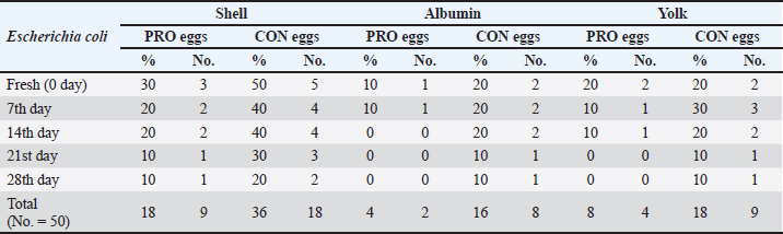 Our study showed in Table 5 a significant variation in the weight of albumin in CON eggs and PRO eggs. During the refrigerated storage period, the albumin weight in CON eggs and PRO eggs decreased in albumen weight with an increased storage period. Also, our results revealed that the statistical analysis of the pH of albumin has more significant difference variations among CON and PRO eggs at different cold storage periods. On the 28th day, it was higher significantly in pH than the other storage periods in CON and PRO eggs. Also, the albumin pH of the 2 groups increased with an increase in storage period. The significant difference in Table 6 is seen in the weight of the yolk of CON and PRO eggs at the different cold storage periods. Also, there were significant variations seen in the pH of the yolk of CON and PRO eggs at different cold storage periods. During the refrigerated storage period, the yolk weight in CON and PRO eggs increased in yolk weight with the increased storage period. Also, the yolk pH of the two groups increased with an increased storage period. DiscussionThe highest prevalence of Salmonella was found in eggshells (12% in CON eggs). On the contrary, the contents of the egg had the lowest incidence of Salmonella in albumin (6% in CON eggs) and in the yolk of eggs (6% in CON eggs). On the other hand, we failed to detect Salmonella in any part of PRO eggs samples. The obtained results of our study were similar to the results obtained by Mansour et al. (2015) who recorded the occurrence of Salmonella in the egg contents (1.2%) and it is lower than in eggshells (4.7%). In another study, Salmonella was isolated from fresh eggshells (6.5%) and egg contents (5.6%) and from stored eggshells (2.8%) and egg contents (7.5%) (Adesiyun et al., 2005). The failure of detection Salmonella from probiotic-supplemented egg contents and eggshells, as the growth promoter, may inhibit the isolation of Salmonella (Sadek et al., 2016). Salmonella coul d not be isolated from the egg contents at fresh and stored eggs until 4 weeks of storage. Isolation from the shell of the fresh egg (0.22%) decreased at storage eggs at 4 weeks of storage to (0.22%) (Stepień-Pyśniak, 2010). Regarding E. coli, it was isolated from eggshells by 36% in CON eggs, and 18% in PRO eggs, which were higher than egg contents which had the incidence of E. coli in albumin (16% in CON eggs, and 4% in PRO) and in the yolk of eggs (18% in CON eggs, and 8% in PRO eggs). Khan et al. (2016) recorded that table eggs were contaminated with E. coli and the highest incidence of E. coli was found in eggshells when compared with eggs’ components (in egg shell 15%, in albumin 12%, and in yolk 10%). Our results were in agreement with the results recorded by Adesiyun et al. (2005) who found that E. coli on eggshells was (58.7%) and (4.3%) in egg contents. Table 5. Chemical and physical characteristics of albumen (weight and pH) of the examined control group and probioticssupplemented group during refrigerated storage.