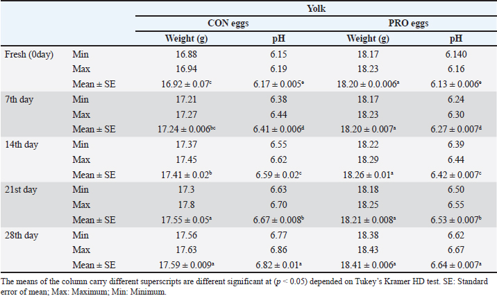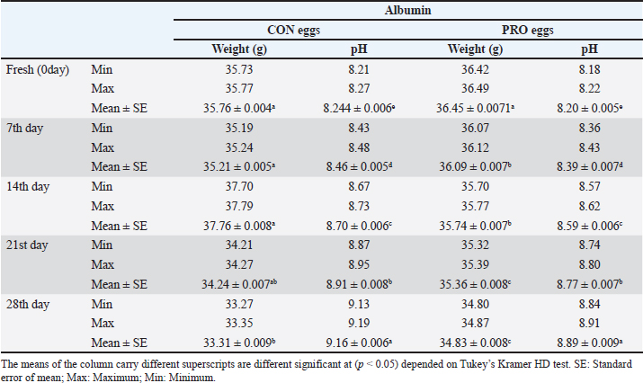 Upon storage, on egg albumin, E. coli at fresh eggs (0.67%) decreased with storage to (0.44%) at 4 weeks of storage. Similarly, E. coli at fresh eggs (0.45%) decreased with storage to (0.17%) at 4 weeks of storage. Also, on eggshells E coli at fresh eggs (2.63%) decreased with storage times to (0.47%) at 4 weeks of storage (Stepień-Pyśniak, 2010). In contrast, isolated microorganisms from eggs and contents might live at several different temperatures i.e. (4°C and 60°C). However, Salmonella could not be isolated, and this explains why all eggs were free from Salmonella (Osei-Somuah et al., 2006). Since E. coli is normally considered an inhabitant in a hen’s intestine; it is easily found on eggshells, and moreover, in egg contents. Thus, it gets its pathogenic importance. It also causes public health hazards and diarrhea (Awny et al., 2018). The presence of E. coli in eggs is a major indication of fecal contamination in eggshells, which causes hazards to human public health (Sadek et al., 2016). The Microbial Gut community plays a great role in the performance and health of the host. Therefore, the ability of probiotic supplements to promote the health effects gained a higher scientific interest in the last years (Duggan et al., 2002). For PRO eggs at fresh days were (62.26 ± 0.007 g) and at 28 days were (60.814 ± 0.008 g) with 1.4% weight loss. For CON eggs at fresh day was (60.064 ± 0.28 g) and at 28 days was (58.248 ± 0.009 g) with 1.816% weight loss. The results declared a decrease in egg weight loss by increasing the storage time in PRO eggs than CON eggs. The eggs from PRO-supplemented hens saw an accumulative loss of weight 11% lower than the eggs from control hens with a 15% lower weight loss was agreement with the result (Camila et al., 2022). Egg weight loss increased by the time of cold storage periods (7th day-21st day) from (1.91 g) to (3.60 g) these results were shown by Okoleh and Eze (2016). The decrease in the weight of the egg on the 7th day (0.36 g) and on the 14th day (0.57 g) during cold storage periods was concluded by Walsh et al. (1995). The significant decrease in the weight of eggs observed during the period of storage (4 weeks) could be caused by the increase of pores on the shells of aged eggs. The increase of the pores of the shell may cause easy escaping of gases and moisture from eggs. The carbonic acid breakdown occurred inside the albumin and then produced water and carbon dioxide. Carbon dioxide escapes from the pores of the shell and the albumin becomes watery and loses its thickness, this is the cause of weight loss of eggs (Eke et al., 2013). The highest thickness of eggshell (mm) was reported on laying day (fresh) in PRO (0.36 ± 0.002) and in CON eggs (0.35 ± 0.005); however, on the 28th day, the lowest thickness of shell egg in PRO (0.32 ± 0.001) and in CON eggs (0.31 ± 0.002). The PRO eggs reported an increase in the weight of shell eggs by 1% when compared to the control group (Camila et al., 2022). These results differed from the results obtained by Kralik et al. (2014). They concluded that the cold storage periods have no effect on the thickness of eggshells. In our study, the statistical analysis of the weight of albumin showed significant variation in PRO eggs on the fresh day (36.45 ± 0.0071) and on the 28th day (34.83 ± 0.008). Also, in CON eggs there was a significant difference on a fresh day (35.76 ± 0.004) and on the 28th day (33.31 ± 0.009). The mean albumin weight of PRO eggs on the lying day was (36.16 ± 0.623) and on the 28th day was (33.83 ± 0.793). While in CON eggs, there was a significant difference on the laying day (35.76 ± 0.613) and on the 28th day (33.31 ± 0.227) (Camila et al., 2022). Also, a decrease in the weight of albumin in fresh eggs (41.12 g) and in eggs stored for the 28th day (39.96 g) was seen (Kralik et al., 2014). Albumin produced in the magnum by the epithelial cells also contains protein and a clear colloidal solution. The quality of albumin is considered a parameter of protein quality and the freshness of an egg. Loss of albumin weight showed in the probiotic supplements, due to high deposition of protein on eggs. It happens due to intestinal microbiota modulation that provides good digestion and absorption of nutrients (Sobczak and Kozlowski, 2021). The weight of yolk gradually increases from the fresh day (lying day) in PRO eggs (18.20 ± 0.006) and (18.41 ± 0.006) on the 28th day of storage, also fresh day (laying day) in CON eggs (16.92 ± 0.07) and (17.59 ± 0.009) at the 28th day of storage. Other scientists reached nearly the same results that probiotics gradually increased the yolk weight from fresh day in PRO eggs (21.34 ± 0.005) and (23.05 ± 0.003) until the 28th day of storage, also from fresh day in CON eggs (21.07 ± 0.04) and (22.36 ± 0.002) until the 28th day of storage (Gunhan and Kirikçi, 2017, Camila et al., 2022). The yolk weight increase is due to the functionality of hepatocytes to synthesize the Vitellogenin (Kasiyati et al., 2016). Vitellogenin is considered a protein that is responsible for the transportation of lipids to the yolk from the liver. Regarding the pH of albumin, it determines the quality of albumin. So that it measured the egg freshness (Scott and Silversides, 2000). Our results revealed that the statistical analyses of the pH of albumin on a fresh day (lying day) PRO egg pH mean was (8.20 ± 0.005) and (8.89 ± 0.009) on the 28th day of storage. Fresh day (laying day) in CON egg pH mean was (8.244 ± 0.006) and (9.16 ± 0.006) on the 28th day of storage. Camila et al. (2022) also discussed that and found that Albumin pH increased gradually from the fresh day in PRO eggs (9.15 ± 0.003) and (9.42 ± 0.008) until the 28th day of storage and from the fresh day in CON eggs (9.16 ± 0.02) and (9.51 ± 0.002) until the 28th day of storage. Therefore, the significant increase in pH of albumin with the increase of the storage time. Our results were simil