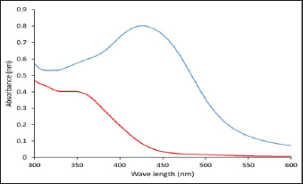 Fig. 1. The UV-VIS spectroscopy of T. foenum-graecum extract (red line) and the produced AgNPs-FG (blue line). Surgery was carried out in all rabbit groups to induce a bone defect (3.5 mm in diameter) at the proximal metaphysis of the right tibia in each rabbit. In group 1 (control group), (n=10) treated with placebo saline injection at the bone defect, group 2 (n=10) treated with Ag-NPS FG gel injection at the bone defect, group 3 (n=10), treated with an injection of plain gel at the bone defect, and group 4 (n=10) treated with FG gel injection at the bone defect. The Animal Welfare and Ethics Committee of Qassim University approved the protocol of the study. Surgical procedureAnesthesia of studied rabbits was carried out using a combination of xylazine hydrochloride (5 mg/kg, Rompun 2%, Bayer, Turkey), and ketamine hydrochloride (25 mg/kg, Ketaset, Zoetis, NJ). Intravenous (IV) administration of cefazolin (20 mg/kg, IV, ear vein) as a prophylactic antibiotic 30 minutes before surgery. The rabbit was placed in lateral recumbency, as soon as appropriate depth of anesthesia had been achieved, with subsequent clipping and proper aseptic preparation of the right hindlimb for surgery. A 3 cm skin incision was made; the right tibia of the rabbit was exposed (Fig. 5A). A 3.5-mm defect was created on the proximal extremity of the tibia at the level of the distal end of the tibial tuberosity. A 3.5 mm diameter drill bit was used to drill a hole in a mediolateral direction. After drilling the bone, the surgical site was cleaned and washed with sterile normal saline, group 1 (n=10) was injected with placebo saline at the bone defect, group 2 (n=10) was injected with Ag-NPs FG gel at the bone defect, group 3 (n=10) was injected with plain gel at the bone defect, and group 4 (n=10) was injected with FG gel at the bone defect. Suturing of the muscles and skin was performed in a routine manner. The preoperative antibiotic was continued for 3 days following surgery, and the surgical site was inspected daily for infections and swelling. Radiographic assessmentRadiographic assessment of the healing process of tibial bone defect was carried out at time 0 post-operatively and weekly for 8 weeks using Min X-ray HF 100/30 generator (Toshiba, Japan) 40 KV, 0.7 mAs, and a 70-cm focal film distance. Standard craniocaudal and lateromedial radiographs were obtained for each operated rabbit. All obtained radiographs were precisely interpreted at different times until complete healing. Scoring of bone radiographs was achieved using the modified RUS system from 1 to 4 grades as follows; visible fracture line and absent callus (score 1), visible fracture line and visible interrupted callus (score 2), invisible fracture line and visible bridging callus (score 3), and no fracture line and no callus (score 4). The scores of all cortices were then combined to give a minimum score of 4 (definitely not healed), and a maximum of 10 (completely healed). Blood sampling and laboratory analysisBlood samples were taken from the ear vein into plain vacutainer tubes using a 23-gauge, 1.5-inch needle (Mais Co., Saudi Arabia). These samples were taken on days 0 (before surgery) and at a week interval for 8 weeks postoperatively to evaluate the healing of tibial bone defect among the studied groups. The blood samples were centrifuged at 3,000 rpm for 15 minutes to obtain clear serum; then sera were preserved in a deep freezer at −20°C. Sera was used to detect serum levels of Bone turnover markers, including bone alkaline phosphatase (BAP) and osteocalcin (OC), using a commercial immunoassay kit (MybBioSource, USA) was followed, according to Al-Sobayil (2008 and 2010). Serum levels of calcium and phosphorus were also detected using commercially available test kits (Mybiosource, USA), and spectrophotometry techniques, according to Anaraki et al. (2021). Histopathological evaluationFor histopathological evaluation, the right hindlimb was taken from each rabbit, and the soft tissues were removed before dissection. The cross-section at the bone defect region was cut by a moderate speed saw. Following that, 10% neutral buffered formalin was used for the fixation of each slice. The bone samples were treated for routine histological examination after being decalcified in 15% buffered formic acid solution. From the center of each specimen, two 5 μm in thickness sections were cut, then stained with hematoxylin and eosin. Two pathologists reviewed and scored the sections blinded using Huo et al. (1991) scoring system. Statistical analysisThe obtained data was statistically analyzed using a statistical software package (SAS version 8, SAS Institute Inc., USA). For the continuous data, mean ± SD were presented. However, for scored data, the median and range were presented. Repeated measure analysis of variance (ANOVA) was used to assess the effect of both treatment and time. Wilks’ Lambda was used to assess the interaction between treatment and time. The sphericity assumption was used to assess the within group (time). When Wilks’ Lambda provided significance (p < 0.05), further One-way ANOVA with post hoc Duncan comparison test was used to assess the difference in time of healing among groups. Results were considered significant at values of p < 0.05. Ethical approvalThe Animal Welfare and Ethics Committee of Qassim University (No. 369) approved the study protocol. ResultsPreparation and evaluation of AgNPs-FGAgNPs were efficiently prepared using the T. foenum-graecum extract, as pointed out by the color change from light yellow to faint reddish. The UV-VIS spectroscopy showed evidence of NPs formation as depicted in Figure 1. The produced spectra for AgNPs-FG showed the highest absorbance at 423 nm which is specific for the AgNPs surface plasmon resonance effect. This absorbance value comes in accordance with other researchers formulating AgNPs using a green synthesis approach (Abdellatif et al., 2020b). The produced AgNPs-FG also show