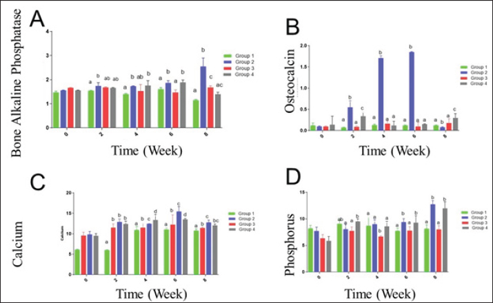 Fig. 6. (A) BAP, (B) OC, (C) Calcium (Ca), and (D) Phosphorus (Ph.) levels for rabbits with tibial bone treated by normal saline control group (group1), AgNPs-FG (group 2), plain gel (group 3), FG-gel (group 4). There was a significant increase in BAP, OC, Ca, and Ph levels in group 2 compared to the control group and other treated groups. Significant increases (p < 0.05) in calcium levels were found in rabbits treated with AgNPs-FG gel (group 2), beginning from the second week to the eighth week postoperatively compared to the control group, and from the sixth week and onward compared with other treated groups (Fig. 6C). Levels of phosphorus were significantly increased (p < 0.05) in rabbits treated with AgNPs-FG gel (group 2), and in rabbits treated FG-gel (group 4) starting from the sixth week and onward postoperatively in comparison with the control group and rabbits treated with plain gel (group 3) (Fig. 6D). Histopathological findingsHistopathological examination of the studied groups revealed an observable empty gap at the site of bone defect at zero weeks postoperatively in all investigated groups (Fig. 7A). At second week postoperatively, fibrous tissue formation was observed in groups 1 and 3 (Fig. 7B), while immature bone formation (Woven bone) was observable in both group 2 (Fig. 7C) and group 4 (Fig. 7D) at the same time. Mature bone formation was observable in the fourth week postoperatively in groups 2 (Fig. 7E) and 4 (Fig. 7F) of the tested groups. DiscussionGreen synthesis in bio-nanotechnology is an eco-friendly and non-toxic method that uses safe natural materials such as FG and plant extracts to synthesize metal NPs. It offers cost and environmental benefits compared to traditional physical and chemical methods (Mtibe et al., 2018). The seeds part of FG was used in this study. Seeds were boiled in Millipore water for extraction of the active constituents. The extract was yellow in color. Due to mixing the extract with 1 ml of AgNo3, the FG extract was changed to faint reddish color as a result of reduction of Ag+ to Ag0. The formed AgNPs-FG was obtained and stabilized due to the nucleation of Ag0 by forming a layer of flavonoid around the Ag0. This layer is essential for the stability and healing activities of AgNPs-FG. It was reported by Abdellatif et al. (2022a–d) that AgNPs-FG is a safe type of NPs that does not harm normal cells. Their small size of 10 nm allows for easy ionization, which can release Ag+ and be toxic to cell lines only (Abdellatif et al., 2022c). AgNPs can be absorbed by cells through endocytosis, but once inside endosomes, they have low cytotoxicity due to limited accessibility and low ionization. The FG reduced the silver nitrate aqueous solution to produce eco-friendly AgNPs by combining electrons with the silver ion. The AgNPs combine to produce the AgNPs-FG, which is hydrated around and covered with the FG as part of the nanosilver stabilization, as represented in equation 2.