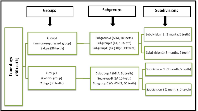 Fig. 1. Flow diagram showing the classification of samples in different groups, subgroups and subdivisions. MTA: Mineral trioxide aggregate, BA: Bio-aggregates and Ca(OH)2: Calcium hydroxide. All teeth were swapped with 0.5% povidone-iodine solution and isolated with a rubber dam. Deep class V buccal cavities (approximately 2.5 mm width, 3 mm length, and 1.5–2 mm depth) were produced almost 1 mm coronal to the gingival boundary with a # 2 inverted cone carbide bur at high speed while irrigated with normal saline solution (Saleh et al., 2016). For pulp exposure, a sterile sharp probe was used. Rinsing with sterile saline achieved hemostasis, and the capping materials were mixed and applied according to the manufacturer’s instructions. The MTA paste was made by combining three parts of powder and 1 part of water using a sterilized glass slab and a metal spatula. The BA paste was made by thoroughly mixing three parts powder and one part liquid on a sterilized glass slab using a plastic spatula. The MTA carrier administered both MTA and BA pastes to the exposure locations, which were then softly condensed using a moist cotton pellet. The Ca(OH)2 paste was made by combining equal amounts of base and catalyst on a sterile paper pad. A tiny calcium hydroxide applicator was used to apply the soft mix to the exposure site with minimum pressure, after which it was allowed to set. The cavities were eventually sealed with glass ionomer cement (Riva, SDI, Australia). Histopathological examinationFollowing the observation period, the dogs were euthanized by anesthetic overdose using 20 mL of 5% Thiopental sodium solution (Thiopental sodium®, EPICO, Giza, Egypt) administered by fast intravenous injection. A block of each capped tooth and its surrounding bone was preserved in 10% neutrally buffered formalin solution for three days before being decalcified in 20% formic acid and 25% sodium citrate solution for four months (Saleh et al., 2016). The specimens were dried in alcohol, cleaned in xylene, embedded in paraffin wax, and serially sectioned on the buccolingual plane, including the capping site and pulp. Each tooth yielded five cross-sections measuring 5 µm thick. These cross-sections were stained with hematoxylin and eosin to interpret the inflammatory cell response and dentine bridge development in the following way: Qualitative evaluationFour sample fields from each slide were examined at X10 and X40 magnifications for qualitative assessment of pulp tissue features such as inflammatory cell infiltration, pulp architecture, focal necrotic areas, vasodilatations, and dentine bridge formation. The chosen fields should be of good architecture and without any staining artifacts. Quantitative evaluation of the inflammatory cellsThe total number of inflammatory cells in each microscopic area was determined using image analysis software (Image J, 1.41.NIH, USA). The photographs were transformed into 8-bit greyscale images. To avoid counting other cells such as fibroblasts, the threshold for inflammatory cells ranged from 38 to 120 pixels (based on their area). Evaluation of dentinal bridge developmentDentine bridge creation was graded using Mahmoud et al. (2010) criteria. Briefly, values 0, 1, and 2 indicate no, partial, and full dentine bridges, respectively. The dentinal bridge thickness was determined using image analysis software (Image J). A line was drawn across the dentinal bridge’s maximum thickness, measured in pixels, and then translated to micrometers. Statistical analysisThe results were given as means and standard deviations (SDs). The Kruskal-Wallis test was performed to compare control and azathioprine groups with their respective materials (subgroups). The Mann-Whitney test was used to investigate the differences across evaluation times (one and two months). A Tukey HSD test was used for multiple comparisons. Test findings with p < 0.05 were considered statistically significant. Statistical analysis was conducted using IBM SPSS Statistics Version 23 (IBM Corporation, Armonk, NY). Ethical approvalThe Institutional Ethics Committee at the Faculty of Dentistry, Ain Shams University-Egypt, accepted the study protocol (Approval No. 17-04-11-Endo). This project followed all international and institutional criteria for animal care and usage, including the Animal Research: Reporting in Vivo Experiments guidelines (ARRIVE). ResultsQualitative findingsGroup I (immunosuppressed group) One month following pulp capping in azathioprine-immunosuppressed dogs, MTA exhibited a damaged odontoblastic layer opposite to the exposure site, areas of superficial necrosis, and loss of normal pulp architecture, without evidence of dentine bridge formation (Fig. 2a). Inflammatory cell infiltrates were seen in the deeper layer of the pulp (Fig. 2b). Subgroup B (BA subgroup) had the same pathological findings found in the MTA subgroup; however, partial dentine bridge formation and areas of newly formed fibrous tissue were seen in the middle part of the pulp (Fig. 2c and d). Subgroup C (Ca(OH)2 subgroup) exhibited the same pathological findings as the MTA subgroup (Fig. 2e) but the pulp tissue was heavily infiltrated with inflammatory cells (Fig. 2f). In subdivision 2 (at two months), subgroup A exhibited an organized odontoblastic layer opposite to the partially formed dentine bridge (Fig. 3a). Newly formed fibrous tissue with inflammatory cells infiltrates was noted in the middle of the pulp (Fig. 3b). Subgroup B exhibited a damaged odontoblastic layer with a partial dentine bridge formation (Fig. 3c). Areas of tissue degeneration and congested blood vessels were also seen (Fig.3d). Subgroup C had a damaged odontoblastic layer with areas of necrosis and no dentine bridge formation (Fig. 3e). Inflammatory cell infiltration and numerous dilated and congested blood vessels were seen in the middle portion of the pulp (Fig. 3f).
