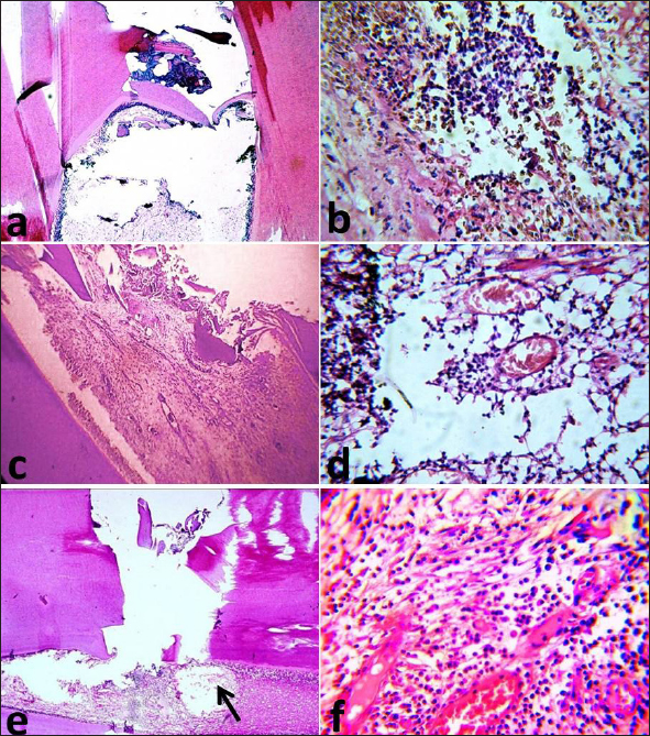 Fig. 3. Photomicrographs of the immunosuppressed group after two months. MTA subgroup showing the exposure site with partial dentine bridge formation (a), newly formed fibrous tissue and inflammatory cell infiltration (b). BA subgroup showing partial dentine bridge formation (c), dilated and congested blood vessels with areas of degeneration (d). Ca(OH)2 subgroup showing absence of dentine bridge formation, an area of necrosis (arrow), a destructed odontoblastic layer (e), dilated and congested blood vessels and inflammatory cell infiltration (f). The images (a), (c) and (e): H&E, X10 while (b), (d), and (f): H&E, X40. In subdivision 2 (after two months), the superficial portion of the pulp regained its integrity and the connective tissue stroma resembled that of normal pulpal architecture in subgroup A. There was a well-organized odontoblastic layer with no inflammatory cell infiltrates and no dilated blood vessels opposite to the completely formed dentine bridge (Fig. 4c). Subgroup B exhibited an irregular odontoblastic layer with areas of degenerations and complete dentine bridge formation. Few inflammatory cell infiltrates in the superficial and middle portions of the pulp were seen (Fig. 4d). In subgroup C, the superficial portion of the pulp exhibited organization and regularity of the odontoblastic layer with areas of degeneration opposite to the completely formed dentine bridge. The connective tissue resembled that of the normal pulp with dilated blood vessels and no inflammatory cells.