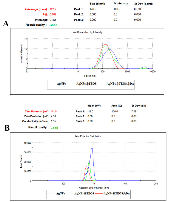 Fig. 1. Dynamic Light Scattering (DLS) analysis. (A) Hydrodynamic diameters (Z-average (nm) of all nanostructures. (B) Zeta potentials (mV) of all nanostructures. Morphology analysis using FESEMThe shape and morphology of the synthesized nanoparticles were conducted through field emission scanning electron microscopy (FESEM). FESEM images provide compelling visual insights into the structural characteristics of AgNPs [at] TEOS [at] DA. Effect of incubation timeTo assess the absorption efficiency of Cd (II) using the proposed nano sorbent (AgNPs [at] TEOS [at] DA), we examined the impact of various incubation times (5, 15, 30, and 60 minutes) under different initial concentrations of Cd (II) solution (0.05, 0.1, 0.2, 0.4, 0.5, and 1 mg/ml). The results presented in Figure 4A provide valuable insights into the absorption kinetics of Cd (II). During the initial 5-minutes incubation period with varying Cd (II) solution concentrations, no significant increase in absorption efficiency was observed. The absorption efficiency ranged from 27.87% for the lowest concentration (0.05 mg/ml) to 25.66% for the highest concentration (1 mg/ml). These results indicate that at this early stage, the absorption process is still developing and that equilibrium has not yet been reached. When the incubation time was extended to 15 minutes, a remarkable shift in the absorption efficiency was noted across different Cd (II) concentrations. The absorption efficiency ranged from 92.74% for the lowest concentration (0.05 mg/ml) to 30.90% for the highest concentration (1 mg/ml). Notably, what makes this observation particularly significant is the consistent and stable absorption efficiency observed at this time point across all Cd (II) solution concentrations.