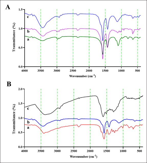 Fig. 2. FT-IR spectroscopy. (A) FT-IR spectra of TEOS (a), AgNPs (b), and AgNPs [at] TEOS (c). (B) FTIR spectra of DA (a), AgNPs [at] TEOS (b), and AgNPs [at] TEOS [at] DA (c). Effect of pHThe acidity of a solution plays a pivotal role in the adsorption process, as it significantly affects the adsorption capacity (Dil et al., 2017). To gauge the influence of pH on removal efficiency, a series of tests were conducted within a pH range of 4–8. The results are shown in Figure 4B. In solutions with lower pH values, an abundance of hydrogen ions is present. According to the principles of surface complex formation, hydrogen ions are preferentially absorbed rather than metal ions. Effect of initial Cd (II) ions concentrationThe batch adsorption experiments were systematically conducted over a range of initial Cd (II) concentrations, specifically 0.05, 0.1, 0.2, 0.4, 0.5, and 1 mg/ml, while maintaining a constant pH of 6. In each adsorption test, 1 mg/ml AgNPs [at] TEOS [at] DA was employed, and the contact time was standardized to 15 minutes. The results in Figure 4C provide valuable insights into the impact of the initial Cd (II) concentration on the adsorption process. As the initial Cd (II) concentration increased from 0.05 to 1 mg/ml, a notable trend emerged in the quantity of Cd (II) adsorption, which exhibited a decline. The removal efficiency was particularly high at low initial Cd (II) concentrations, primarily due to the availability of unoccupied binding sites on the adsorbent. In contrast, at higher Cd (II) concentrations, these binding sites were nearly entirely covered, resulting in a decrease in the removal efficiency as the metal concentration increased.