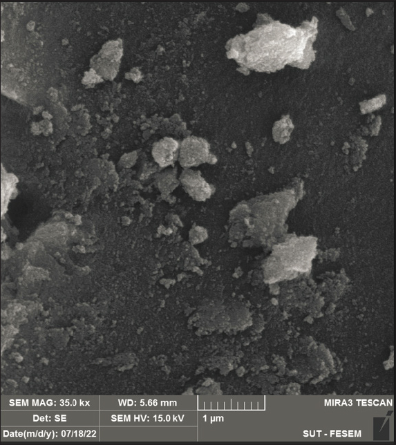 Fig. 3. Analysis of AgNPs [at] TEOS [at] DA Morphology using FESEM technique. Antibacterial activity of the nanoparticlesThe statistics showed that nanoparticles and isolates worked well in combating different bacteria species. ANOVA showed that inhibition zones varied between isolates and that some treatments were much better (p < 0.05). SP had the highest inhibition zones for various bacteria and was the most effective. These findings underscore the ability of specific nanoparticles such as SP to have better antibacterial properties and the need to tailor formulations to bacterial specificity (Fig. 5). DiscussionThe antibacterial activity of the nanoparticles against fish-borne bacteria is consistent with previously reported values. AgNPs have shown, for example, that they are bactericidal against the fish pathogen Aeromonas sp. and can thus be applied to aquaculture (Shaalan et al., 2016). The same can be said of zinc oxide nanoparticles that exhibit broad-spectrum antimicrobial activity, destroying bacteria such as E. coli and S. aureus (Krishnamoorthy et al., 2022). These studies confirm what we found: nanoparticles could potentially be an effective alternative to conventional antibiotics for the treatment of bacterial infections in aquaculture (Karim et al., 2018; Yaseen et al., 2020; Abd-Alhassen et al., 2021; Ghazi et al., 2024). However, nanoparticle concentration, environmental impact, and resistance formation are essential for their long-term use.
