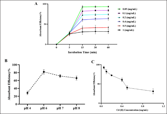 Fig. 4. (A) Effect of incubation time on Cd (II) absorbance percentage. Experimental conditions: pH=6, adsorbent dose=1 mg/ml, temperature 25 °C. (B) Effect of pH on Cd (II) absorbance%. Experimental conditions: incubation time 15 minutes, initial Cd (II) ions concentration 0.1 mg/mL, adsorbent dose 1 mg/ml, and temperature 25 °C. (C) Effect of initial Cd (II) ions concentration on Cd (II) absorbent efficiency%. Experimental conditions: incubation time, 15 minutes; pH, 6; adsorbent dose, 1 mg/ml; temperature, 25 °C. The green synthesis strategy of AgNPs [at] TEOS [at] DA is the unique feature of this system (Gharbavi et al., 2020a). This is why synthesis is performed without the need to use toxic reagents and organic solvents (hence “green chemistry”). Not only does this help prove the environmental quality of the nanocomposite, but it also shows that it is a good option for environmental protection. The surface charge properties can be applied to such nanostructures for environmental cleanup and other purposes because they affect how the nanoparticles behave in solution and how they interact with the target species, such as heavy metal ions (Gharbavi et al., 2019). The AgNP [at] TEOS TEOS coating is larger because it creates a shell around the nanoparticles. The second step (DA) modification of AgNPs [at] TEOS [at] DA doubled the size of the nanocomposite, largely because organic molecules were adsorbed on the nanocomposite surface. These hydrodynamic changes in size matter how these nanoparticles disperse in the solution. They are also larger, suggesting a tendency toward sedimentation and decreased movement. But the price is the more surface area for adsorption and reactivity, the higher the surface area, which is extremely useful in the heavy metal removal industry, where a larger surface area can increase the adsorption capability (Gharbavi et al., 2020b). This property is important, especially in applications that require predictable and well-scattered nanoparticle networks (Gharbavi et al., 2020c). There is also a curious bending resonance at approximately 1,100 cm1. These ghostly signatures speak loudly to the existence of Si-OH bonds and Si-O-Si motif and speak loudly of the emergence of AgNPs [at] TEOS. Notably, the fact that Ag NPs are not left with distinct footprints in the FT-IR spectra indicates that they are bound to TEOS, revealing the emergence of AgNPs [at] TEOS (Geng et al., 2022). A highlight in the FT-IR spectrum of AgNPs [at] TEOS [at] DA shows a bright peak at approximately 3,400 cm1. This peak is due to the stretching vibrations of O-H and N-H bonds, which are common functional groups of DA. This peak can be observed in Figure 2B. It is especially interesting to observe how DA interacts with the TEOS molecule in the nanocomposite. Perhaps the most dramatic result is a clear peak around 1,650 cm1 in the FTIR band of AgNPs [at] TEOS [at] DA (Rajeshwari et al., 2022). This vibrational resonance is due to the bowing vibrations of the N-H bond, which is the amide (NH2) functional group. The occurrence of this peak represents amide bonds between DA’s amino groups and the TEOS group, which in turn gives rise to the amine-functionalized AgNPs [at] TEOS [at] DA. Moreover, the region of the spectral field around 1,100 cm1 is also key to explaining the DA/TEOS coupling. In this area, the Si-O-Si bonds are observed to indicate the TEOS component. The Si-O-Si bonds along with the amide bonds occur at the same time, which indicates a close and coordinated relationship between DA and the TEOS-based silica layer. The FT-IR spectrum of AgNPs [at] TEOS [at] DA confirms surface modification with DA, and the peaks are typical of amide bonds between DA and TEOS-derived silica, and Si-O-Si bond. Such results provide options for custom-designed surface functionalization to improve the strength and performance of nanocomposite. AgNPs [at] TEOS [at] DA is a promising platform for applications that require controlled surface interactions (e.g., effective heavy metal extraction from solutions and controlled drug delivery) (Fig. 2). As seen in Figure 3, an overwhelming and significant point emerges: the nanoparticles are uniformly spherical and near-uniform. Their form is particularly homogenous, with little difference in size and shape. The spherical structure and regularity of these FESEM images represent the accuracy and control of the synthesis procedure (Mousazadeh et al., 2022).