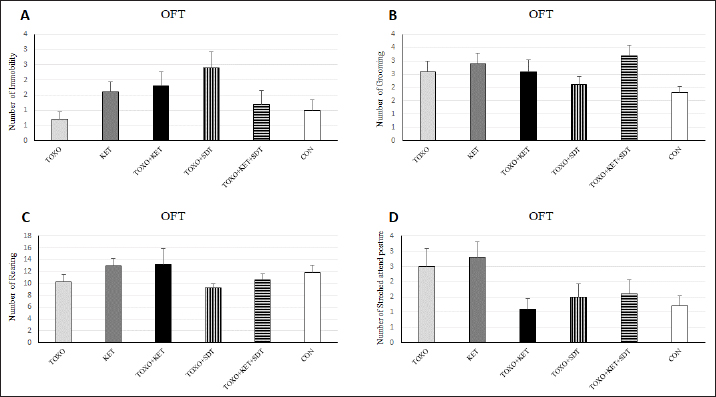Brain antioxidant status and lipid peroxidationAntioxidant enzyme activities catalase (CAT), superoxide dismutase (SOD), glutathione peroxidase (GPx), and malondialdehyde (MDA) content (a marker of lipid peroxidation) were spectrophotometrically measured in brain homogenates from five mice in each experimental group using commercial kits (Navandsalamat, Iran). NMDA-NR1 and NR2A expressionReal-time reverse transcription PCR was performed as previously described (Sun et al., 2021). Brain samples were homogenized in RNAiso (Takara) using a sonicator. Total RNA was isolated using RNAiso following the manufacturer’s instructions. The isolated 1 μg of RNA was reverse-transcribed using the QuantiTect Reverse Transcription Kit (Qiagen). PCR was carried out using the Thermal Cycler Dice Real-Time System TP800 (Takara) with SYBR Premix Ex Taq II (Takara). The primer sequences are listed (Table 1). Quantitation was done using the crossing point method and normalized to 18S rRNA. The effect of gravity changes on 18S rRNA expression was verified and found to be insignificant. Statistical analysisBehavioral data underwent one-way analysis of variance (ANOVA) followed by Student-Newman-Keuls post hoc testing for multiple comparisons between experimental groups. The mRNA expression differences among the groups were analyzed using Tukey’s test. A p-value below 0.05 was considered statistically significant, and all statistical analyses were conducted using SPSS version 26. Ethical approvalThe study was approved by the institutional Research Ethics Committees of Islamic Azad University-Karaj Branch (IR.IAU.K.REC.1401.137). ResultsEffect of treatments on the OFTTo investigate the potential impacts of toxoplasmosis and schizophrenia on the exploratory behavior of mice, we evaluated parameters including the total number of crossings, center crossings, and border crossings in the OFT. As depicted in Figure 1A, the total number of crossings was significantly higher in the TOXO+KET and TOXO + KET + SDT groups compared to CON and TOXO groups (F (5, 54)=36.66, p < 0.001). Notably, the number of border crossings was lower in the TOXO and TOXO+SDT groups relative to the CON (F (5, 54)=19.60, p < 0.001) (Fig. 1B). Moreover, center crossings were elevated in all treated groups compared to CON, with KET, TOXO+KET, and TOXO+KET+SDT displaying significantly higher values than TOXO mice (F (5, 54)=16.48, p < 0.001) (Fig. 1C). However, the time spent in the center was generally higher in all treated groups compared to CON (F (5, 54)=38.77, p < 0.001). Notably, in the TOXO+SDT group, this time was lower than TOXO (F (5, 54)=38.77, p < 0.05) (Fig. 1D). Experimental induction of toxoplasmosis and schizophrenia did not significantly affect the immobility count (F (5, 54)=4.17, p > 0.05) (Fig. 2A), grooming behavior (F (5, 54)=8.74, p > 0.05) (Fig. 2B), rearing activity (F (5, 54)=5.70, p > 0.05) (Fig. 2C), or the number of stretched attend postures (F (5, 54)=2.43, p > 0.05) (Fig. 2D) among the treated mice. Effects of treatments on the EPMTo explore possible anxiolytic-like effects of T. gondii and ketamine in mice, we examined the number of entries into open and closed arms, as well as the time spent in these arms in the EPM. The treated groups, except TOXO, exhibited higher entries into open arms compared to the CON (F (5, 54)=8.40, p < 0.001). Notably, entries into open arms in the TOXO+KET and TOXO+KET+SDT groups were significantly higher than in the TOXO group (F (5, 54)=22.59, p < 0.01) (Fig. 3A). Moreover, the percentage of time spent in open arms was elevated in all treated groups relative to the CON (F (5, 54)=10.17, p < 0.001) (Fig. 3B), while the percentage of time spent in closed arms was reduced in all treated groups compared to CON (F (5, 54)=19.69, p < 0.001) (Fig. 3B). Importantly, the TOXO+KET group displayed the lowest time spent in closed arms, significantly differing from the TOXO group (F (5, 54)=19.69, p < 0.01) (Fig. 3D).