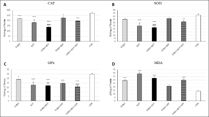 Fig. 5. Effects of experimental toxoplasmosis (TOXO), ketamine-induced schizophrenia (KET), simultaneous toxoplasmosis + Ketamine-induced schizophrenia (TOXO + KET), and sulfadiazine-trimethoprim as the treatment for toxoplasmosis (TOXO+SDT) and toxoplasmosis + ketamine-induced schizophrenia (TOXO+SDT+KET) on the brain activities of CAT (A), SOD (B), GPx (C), and MDA content (D) relative to the control (CON). Values are presented as mean ± SEM for the number of 5 mice per group. *p < 0.05 versus CON, **p < 0.01 versus CON, ***p < 0.001 versus CON, #p < 0.05 versus TOXO, ##p < 0.05 versus TOXO, ###p < 0.001 versus TOXO (ANOVA followed by Tukey’s test).