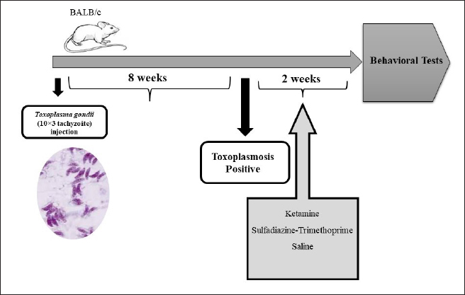 AbstractBackground: Chronic toxoplasmosis has been strongly implicated in the development of psychosis and schizophrenia. Additionally, the understanding of schizophrenia has been significantly reshaped by insights into N-methyl-D-aspartate receptor (NMDAR) hypofunction. Aim: This study aimed to compare the behavioral, antioxidant, and NMDAR changes in mice subjected to Toxoplasma gondii infection and those treated with ketamine to induce schizophrenia-like symptoms. Methods: Sixty male BALB/c mice were divided into six groups: toxoplasmosis (TOXO) (infected), ketamine-induced schizophrenia (KET), TOXO+KET, TOXO+sulfadiazine-trimethoprim treatment (SDT), TOXO+KET+SDT, and control (CON) (uninfected). After 10 weeks post-infection, behavioral tests were conducted, brain antioxidant status and lipid peroxidation were analyzed, and NMDA-NR1/NR2A expressions were assessed. TOXO and KET induced distinct behaviors: hyperlocomotion, anxiety, and memory impairment. Results: Antioxidant enzyme levels decreased, and lipid peroxidation increased in TOXO and schizophrenic mice brains. NMDAR downregulation, especially NR-1 and NR2A, was evident due to T. gondii and ketamine. Sulfadiazine-trimethoprim ameliorated NMDAR downregulation, but not all of the behavioral alterations. Conclusion: Further studies are needed to elucidate specific NMDAR subunit roles in toxoplasmosis-induced pathophysiology, offering potential therapeutic insights. This investigation highlights the intricate relationship between chronic toxoplasmosis, NMDAR dysfunction, and schizophrenia-like behaviors. Insights gained could pave the way for innovative interventions targeting both cognitive and neurological impairments associated with these conditions. Keywords: Antioxidant status, Behavioral alterations, Ketamine, Toxoplasma gondii. IntroductionToxoplasma gondii, a protozoan parasite belonging to the Apicomplexa phylum, stands as a remarkable example of parasitic success, adept at infecting a wide array of warm-blooded animals. Although its intermediate hosts vary extensively, cats uniquely serve as the definitive hosts, supporting the sexual stage of the parasite’s lifecycle and acting as the source of infective oocysts (Mendez and Koshy, 2017). In humans, T. gondii is primarily acquired through the ingestion of oocyst-contaminated soil and water, consumption of undercooked meat harboring tissue cysts, or congenitally from mother to fetus. Once within a host, the parasite’s rapid replicative tachyzoite stage gives way to a chronic phase featuring slowly replicating bradyzoites, encysted within host tissues (Youssefi et al., 2007; Youssefi et al., 2009; Elmore et al., 2010). These cysts, housing bradyzoites, establish lifelong infections in various tissues, with a notable predilection for the central nervous system (CNS) (Matta et al., 2021). Chronic T. gondii infection in rodents has been linked to CNS dysfunction, encompassing alterations in neurotransmitter levels, protein expression, and behavioral shifts such as hyperactivity, cognitive impairments, and aversion to predatory urine odor (Parlog et al., 2015; Alsaady et al., 2019). Furthermore, in humans, chronic toxoplasmosis has exhibited correlations with bipolar disorder, epilepsy, psychosis, and schizophrenia (Elsheikha et al., 2016). Perturbations in diverse neurotransmitters and signaling pathways, including dopamine and γ-aminobutyric acid (GABA), have been observed in T. gondii-infected mice (Mendez and Koshy, 2017). However, incongruent findings from certain studies probing the dopaminergic and GABAergic pathways have introduced controversy regarding the precise role of these neurotransmitters. In recent decades, the emergence of N-methyl-D-aspartate receptor (NMDAR) hypofunction has profoundly influenced our comprehension of schizophrenia’s pathophysiology and treatment (Coyle, 2012). It has been demonstrated that NMDAR antagonists, such as ketamine, can replicate the complete spectrum of psychotic, negative symptom, cognitive, and physiological features of schizophrenia in individuals without the condition. The NMDAR is composed of subunits from two gene families, NR1 (comprising eight distinct spliced forms) and NR2 (A, B, C, and D). Functional NMDARs consist of both NR1 and NR2 subunits, with different combinations of NR2 subunits resulting in NMDARs possessing distinct pharmacological and physiological characteristics. Research involving postmortem brain studies of individuals with schizophrenia has indicated alterations in the expression of various NMDAR subtypes (Weickert et al., 2013). Additionally, it has been proposed that the disruption of normal developmental changes in NMDARs may contribute to the onset of schizophrenia (Snyder and Gao, 2013). Interestingly, studies have reported that T. gondii infection in mice is associated with elevated NMDAR autoantibodies, which play a pivotal role in the development of NMDAR hypofunction (Li et al., 2018). Given the central role of NMDARs in the behavioral alterations and neuropathological features of CNS dysfunction, this study aims to comprehensively compare the behavioral effects, brain antioxidant status, lipid peroxidation levels, and the expressions of NMDA-NR1 and NMDA-NR2A receptors in experimental T. gondii infection with those induced by ketamine, a model of schizophrenia, in mice. Through this investigation, we seek to enhance our understanding of the intricate interplay between parasitic infections, neurotransmitter systems, and neuropsychiatric conditions. Materials and MethodsChemicalsKetamine was purchased from (Trittau-Rotexmedica) Germany. Sulfadiazine and trimethoprim were obtained from Aras Bazar Pharmaceutical Company (Amol, Iran). Phosphate-buffered saline (PBS) was acquired from Art-med (Tehran, Iran). All other chemicals used were of analytical grade and commercially available. ParasitesThe Type II Prugniad strain of T. gondii parasite (Pru) was graciously provided by Professor Ahmad 