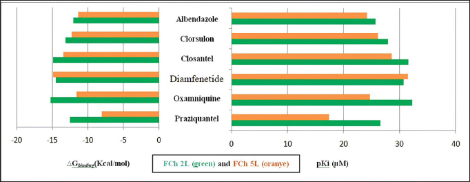 Fig. 3. Free energy (∆Gbinding (Kcal/mol)) and inhibition constant (pKi) of molecular docking results of six anti-trematode ligands.
