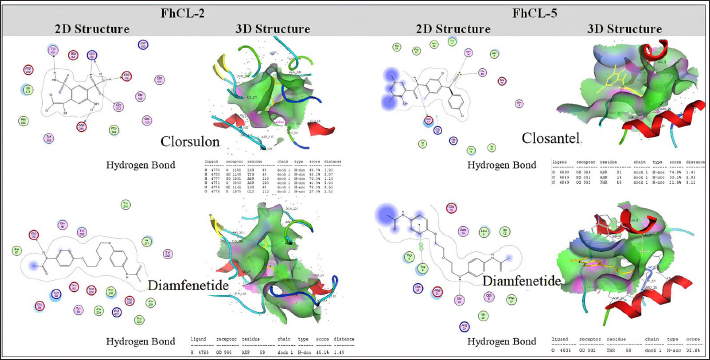 Fig. 4. Visualization of 2D and 3D interactions of ligands with the best affinity on FhCL-2 and FhCL-5. Table 5. Ligand residue contacts during molecular dynamics simulations at 310 ºK.