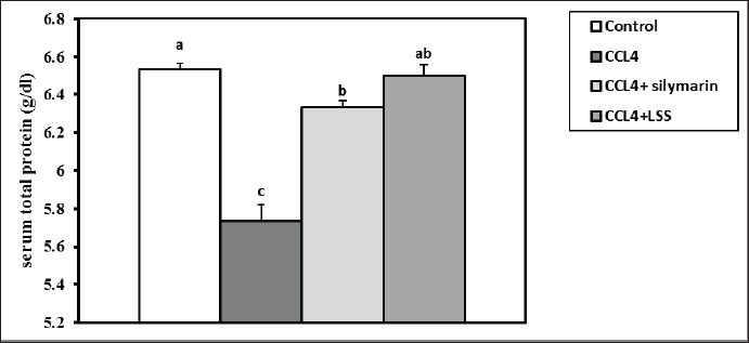 Fig. 1. Effect of Lagenaria siceraria seed oil (LSS), CCL4 and Silymarin on serum total protein concentration in male rat. a,b,c: columns labeled with different letters display significant variations (p<0.05).