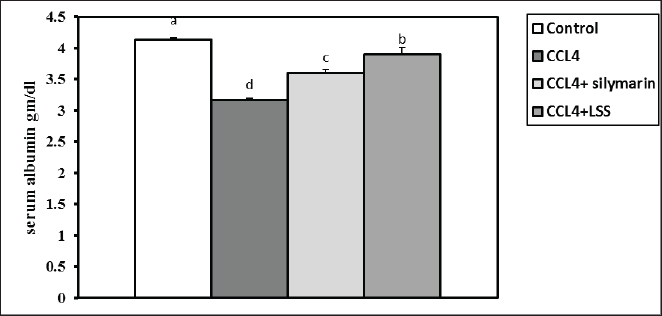 Fig. 2. Effect of LSS, CCL4 and Silymarin on serum albumin gm/dl in male rat. a,b,c,d : columns labeled with different letters display significant variations (p<0.05).