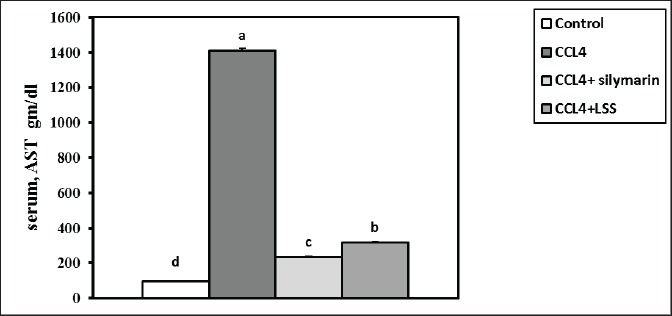 Fig. 6. Effect of LSS, CCL4 and Silymarin on Serum ALT gm/dl in male rat. a,b,c,d : columns labeled with different letters display significant variations (p<0.05).