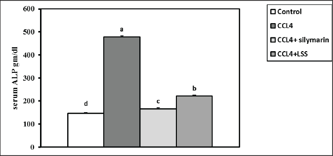 Fig. 7. Effect of LSS, CCL4 and Silymarin on Serum ALP gm/dl in male rat. a,b,c,d : columns labeled with different letters display significant variations (p<0.05). On the other hand, sections from CCL4 + Silymarin-treated rats (Fig. 14E and F) revealed a large to moderate number of hepatocytes (50%–60%) with micro and macrosteatosis and the presence of a few cells with ballooning changes. The portal triads exhibited moderate to severe congestion of portal blood vessels and round cell infiltration. The Kupffer cells appeared hypertrophied, and a few apoptotic hepatocytes were also seen (Fig. 14E and F). Examined liver sections from CCL4 + LSS-treated rats (Fig. 14G and H) showed mild to moderate hydropic degeneration and fatty changes in hepatocytes (40%–45%), mostly in a centrilobular, peripherolobular, and periportal arrangement. The remaining hepatocytes displayed regenerative attempts with enlargement of the nuclei, which appeared hyperchromatic or double-nucleated (Fig. 14G and H).