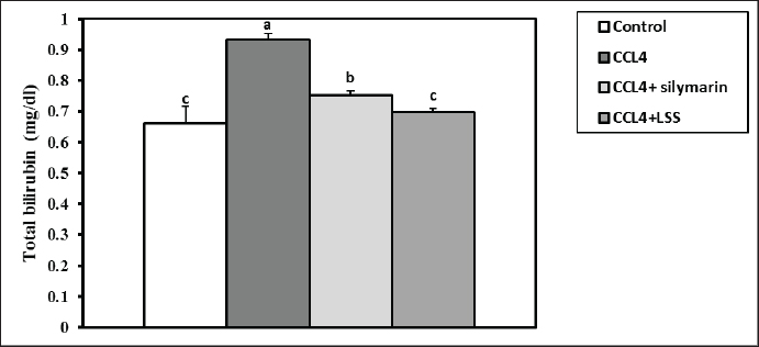 Fig. 8. Effect of LSS, CCL4 and Silymarin on Serum total bilirubin gm/dl in male rat. a,b,c: columns labeled with different letters display significant variations (p<0.05).