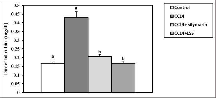 Fig. 9. Effect of LSS, CCL4 and Silymarin on serum direct bilirubin gm/dl in male rat. a,b: columns labeled with different letters display significant variations (p<0.05). DiscussionThe global burden of liver disease is significant, with over one million deaths annually. There is a need to discover effective off-the-shelf hepatoprotective agents. The current study shows that pre-treatment with LSS effectively reduces CCl4-induced liver damage in a rat model. The LSS can effectively restore liver enzymes and redox imbalance induced by CCl4. This study highlights the potential of LSS as a natural remedy for liver damage caused by toxic substances. Lagenaria siceraria has been used in ointments to treat various diseases worldwide. The plant has antioxidant, free radical scavenging, cardioprotective, and hepatoprotective properties (Kumar et al., 2012; Zahoor et al., 2021). LSS is conventionally employed in liver syndromes and diseases induced by different free radicals (Saha et al., 2011b). Hepatocellular damage increases serum enzyme indices circulated from the hepatocytes into the blood (Sreelatha et al., 2009). CCl4 induces hepatotoxicity by forming a covalent bond with membrane proteins and causing lipid peroxidation (Kanter et al., 2005; Wang et al., 2023).
