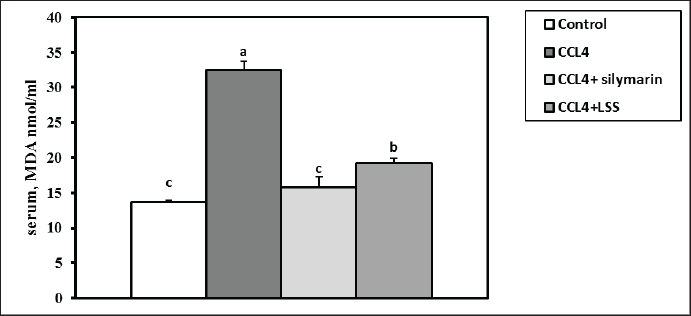 Fig. 11. Effect of LSS, CCL4 and Silymarin on serum MDA nmol/ml in male rat. a,b,c: columns labeled with different letters display significant variations (p<0.05). Liver tissue contains enzymes used as indicators to verify biological liver injury. The enzymes AST, ALT, and ALP are essential for evaluating liver injury (Wang et al., 2023). The hepatoprotective impact of Lagenaria siceraria extracts was assessed by examining liver function biochemical parameters (Saha et al., 2011a). CCL4 has been shown to cause significant hepatic impairment, as indicated by a marked increase in serum ALP, AST, and ALT levels, which are indicators of cellular leakage and deficiency of functional reliability of hepatic cells (Althnaian et al., 2013). The existing report demonstrates the effect of CCL4 on liver-specific enzymes, showing a significant elevation in serum liver enzyme activities in CCL4-treated animals. Rats treated with CCL4, LSS, or Silymarin demonstrated a significant decrease in serum enzyme activities AST, ALT, and ALP. This research is consistent with earlier research by (Lakshmi et al., 2011), where the oral administration of the ethanolic extract of Lagenaria siceraria fruit (LSS) to various groups of rats decreased levels of serum ALT, AST, and ALP (Deshpande et al., 2008).