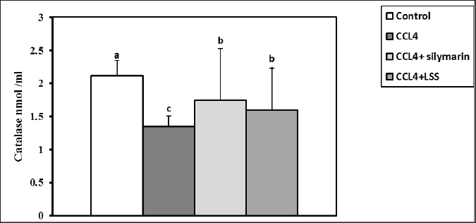 Fig. 12. Effect of LSS, CCL4 and silymarin on serum catalase nmol/ml in male rat. a,b,c : columns labeled with different letters display significant variations (p<0.05).