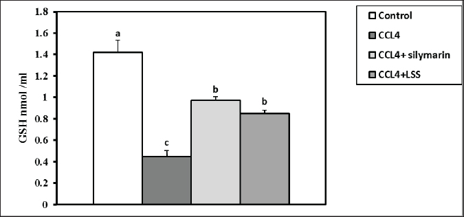 Fig. 13. Effect of LSS, CCL4 and Silymarin on Serum GSH nmol/ml in male rat. a,b,c: columns labeled with different letters display significant variations (p<0.05). Our results were consistent with (Shirwaikar and Sreenivasan, 1996), who reported that the hepatoprotective action of Lagenaria siceraria extract was evaluated by studying its impact on hepatotoxicity induced by the administration of CCl4, with Sylimarin used as a standard. Another biomarker for hepatotoxicity is the levels of total proteins and albumin, primarily produced by the liver. Hypoalbuminemia is commonly observed in advanced chronic liver diseases. In a recent study, acute administration of CCl4 resulted in significant hepatic damage, as evidenced by the decrease in serum albumin, total proteins, globulin levels, and A/G ratio. This decline was attributed to the disassociation of polyribosomes from the endoplasmic reticulum and mitochondrial dysfunction caused by CCl4 administration (Xian et al., 2024). Treatment with LSS in CCl4-induced liver injury showed an increase in serum albumin levels, total protein, globulin, and A/G ratio, confirming the hepatoprotective effect of LSS (Lakshmi et al., 2011). Hepatic damage was also observed with elevated serum total, direct, and indirect bilirubin levels. This increase is attributed to impaired bile excretion by the liver, resulting in elevated bile levels in the serum (Elkington et al., 1969).