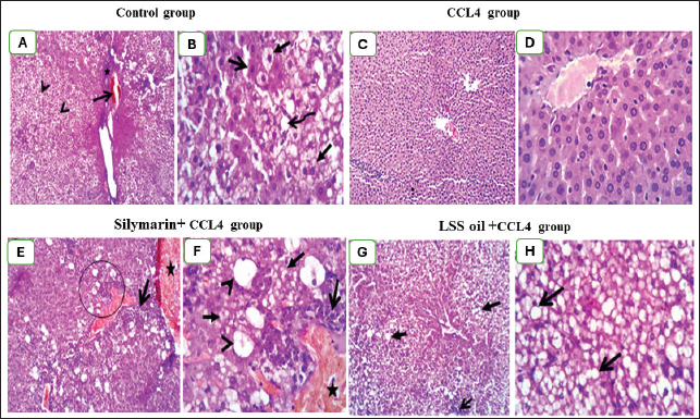 Fig. 14. (A)–(H): Photographs of rat liver section in various treated and control groups. In the control group (14A and 14B), the liver sections of rats showed apparently normal hepatic parenchyma with preserved lobular arrangement, hepatic cords, sinusoids, and vascular tree. Liver section in rats treated with CCL4 treated group (14C) showing ballooning degeneration in a variable number of hepatocytes (arrow heads) beside congestion in portal blood vessels (open arrow) and moderate infiltration of round cells (lymphocytes, macrophages) in portal triads (star, 100X). Moreover, it shows ballooning degenerated cells (closed arrow), signet ring of adipocyte (curved arrow) and apoptotic cells with pyknotic nuclei (open arrow; 14D). The liver of rats in CCL4 + silymarin treated group (14E and 14F), showing vacuolation (closed arrow) mostly macrosteatosis and ballooing changed (arrow heads) with moderate congestion (star) and round cell infiltration in portal triads (open arrow). Lastly, sections from Liver of CCL4 + L.S.S oil treated group (14G, and 14H), showing (14G degenerative changes mostly fatty change in hepatocytes (closed arrows). Interstitial leukocytic infiltration is visible (open arrow), along with micro and macrosteatosis (14H). The first photo in each group was examined at 100X magnification, while the other one was examined at high magnification (400X). The administration of CCl4 to the animals showed a noticeable increase in total bilirubin (Bishayi et al., 2002). Our study reported that treatment with LSS in CCl4-induced liver damage led to a decline in serum total, direct, and indirect bilirubin levels, confirming the potential of LSS to alleviate liver biliary dysfunction. Rats treated with LSS showed a significant reduction in total serum bilirubin compared to those treated with CCl4 alone. The balance of serum total bilirubin and total protein levels through Lagenaria siceraria seeds treatment indicates improved liver function (Mani Senthilkumar et al., 2005). An extreme concentration of Reactive oxygen species (ROS) and other radicals leads to OS in the body, associated with various pathological conditions. Antioxidants can fight OS and ROS by scavenging free radicals or via their effective reductive capability (Halliwell, 2006). Under pathological conditions, an imbalance between OS and antioxidant defense can lead to oxidative damage in cellular membranes, resulting in lipid peroxidation, DNA degradation, and the formation of oligonucleosomal fragments. Elevated levels of lipid peroxides, such as MDA, can be highly cytotoxic (Halliwell, 2006; Raza et al., 2022). In the extant inquiry, the scavenging of both MDA and supporting the CAT and GSH synthesis indicate the potent antioxidant property of LSS. The significant antioxidant action of the extract, as evidenced by the increase in CAT and GSH levels, suggests its potential protective effect. In rats treated with CCl4, hepatotoxicity occurs due to an imbalance between ROS production and the antioxidant system, leading to cellular damage. This is indicated by the decreased levels of CAT and GSH and a significant reduction in lipid peroxidation in the treated groups, further enhancing its antioxidant activity in vivo (Halliwell, 2006; Raja et al., 2007). The protective effect of LSS on liver damage is also evident in histological examinations of hepatic tissue. Histopathological analyses have demonstrated that Lagenaria siceraria extract can protect hepatocytes from damage caused by hepatotoxic agents like CCl4 (Saeed et al., 2022). The protective effects of Lagenaria siceraria extract on the liver include reduced necrosis, inflammation, fibrosis in liver tissue, and the preservation of normal hepatocyte morphology. The extract’s hepatoprotective mechanisms involve scavenging free radicals, modulating antioxidant enzymes, inhibiting inflammatory mediators, and regulating apoptotic pathways in hepatocytes. Bioactive compounds in Lagenaria siceraria, such as triterpenoids, flavonoids, and saponins, are believed to contribute to its demonstrated hepatoprotective properties in histopathological studies. Further studies are needed to understand the molecular mechanisms of LSS to improve liver health and other organs. ConclusionThe study confirmed that LSS has a hepatoprotective effect against CCl4-induced hepatotoxicity in rats. This protective effect is attributed to the antioxidant capacity of LSS, which reduces MDA levels, promotes CAT and GSH activity, and maintains hepatic enzymes within normal ranges. Additionally, it helps maintain the integrity of liver cells and reduces OS, according to histological examination. AcknowledgmentThe authors thank their respective institutes for their support. FundingThis work received no external funds. Conflict of interestThe authors declare that there is no conflict of interest. Authors’ contributionsM.Z. and S.M.E. performed the experiments; N.H.A., S.M.E., and H.M.S. designed the experiments; N.H.A., M.Z., S.M.E., A.K.A., W.E.A., S.G.F., and H.M.S. analyzed data and wrote the initial draft; A.K.A., W.E.A., and S.G.F. revised the manuscript. All authors have read and approved the submission of the final version of this manuscript. Data availabilityAll data are provided in the manuscript. ReferencesAbd El-Hack, M.E., Abdelnour, S., Alagawany, M., Abdo, M., Sakr, M.A., Khafaga, A.F. and Gebriel, M.G. 2019. Microalgae in modern cancer therapy: current knowledge. Biomed. Pharmacother. 111, 42–50. Abd El-Hack, M.E., Alagawany, M. and Abdelnour, S. 2019. Responses of growing rabbits to supplementing diet with a mixture of black and red pepper oils as a natural growth promoter. J. Anim. Physiol. Anim. Nutr. 103(2), 509–517. Abd El-Hack, M.E., Alagawany, M., Farag, M.R., Tiwari, R., Karthik, K. and Dhama, K. 2016. Nutritional, healthical and therapeutic efficacy of black cumin (Nigella sativa) in animals, poultry and humans. Int. J. Pharmacol. 12(3), 232–248. Abd El-Hack, M.E., d