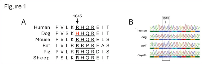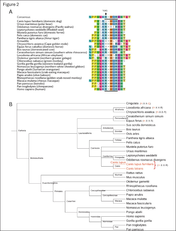Fig. 1. Alignment of the amino acid and gene sequences of the furin-recognition site of FVIII in humans, hemophilia A animal models, and selected genus Canis species. (A) Previously reported amino acid sequences surrounding the furin-recognition motif (underlined) of FVIII in animal-models of hemophilia A: Homo sapiens (gi 182383), Canis lupus familiaris (gi 2645493), Mus musculus (gi 148697282), Rattus norvegicus (gi 34328534), Sus scrofa (gi 47523422), and Ovis aries (gi 284484541). (B) Newly determined gene sequences and predicted amino-acid sequences of F8 of Canis species and human control. Representative sequencing chromatograms are shown for human (Homo sapiens, n=1), domestic dog (C. lupus familiaris, n=12), gray wolf (C. lupus, n=12) and coyotes (C. latrans, n=10). The conservation of the unique H1645 across the genus Canis is identified within the box. Materials and MethodsGenomic DNA from free-ranging gray wolves was extracted from seven fresh blood samples (Barber-Meyer, 2021) using QIAamp Blood Kit (Qiagen, Chatsworth, CA). Gray wolves were live-captured using modified foot-hold traps (Livestock Protection Company’s EZ Grip 7) and released as part of a long-term wolf radio collaring study in the Superior National Forest, Minnesota, USA (48°N, 92°W) (Mech, 2009). The details on trapping, capture, and processing were previously reported (Barber-Meyer and Mech, 2014). In addition, five skeletal muscle specimens were obtained from carcasses. Domestic dog genomic DNA was extracted from blood samples from animals from the University of Pennsylvania Ryan Veterinary Hospital in Philadelphia (n=12). Coyote genomic DNA was extracted from blood samples (n=9) or stool samples (n=5). The latter DNA extraction was done using Macherey-Nagel Lts kit, (Bethlehem, PA) as per the manufacturer instructions. PCR product using degenerated primers for the amplification of the putative furin cleavage site at position 1313 (5’–TCAAAAATAAGGGAAGAAGC-3’ and 5-GTAGCAGGTTTAGAAGAGCA-3’) or at the position 1645 (5’-GAAGGCTTGGNAAATNAAAC-3’ and 5’-CGTGTTTTCTNTTGAAAGCTGCG-3’) was cloned in TOPO PCR cloning kits (Invitrogen, Nazareth, PA) into Top10 cells, and multiple colonies were sequenced for the selected product from each specimen. Genomic F8 DNA sequences from human and dog were used in NCBI blastp (National Center for Biotechnology Information protein-protein BLAST, Basic Local Alignment Search Tool) (Altschul et al., 1990) searches to identify additional species genomic sequences. Alignment of nucleotide and amino acid sequences was carried out in Geneious Prime (Dotmatics, Auckland, New Zealand). A phylogenetic tree was generated with phyloT version 2 (phylot.biobyte.de, operated by Ivica Letunic, Heidelberg, Germany) based on NCBI taxonomy and visualized with iTOL: Interactive Tree of Life version 7.0 (https://itol.embl.de, designed and developed by biobyte solutions, Heidelberg, Germany) (Letunic and Bork, 2024). Ethical approvalThe guidelines of the American Society of Mammalogists for use of wild mammals in research were followed, and the capture of wild wolves was conducted under U. S. Fish and Wildlife permits PRT831774 and TE3886A-0 and the approval of the U.S. Geological Survey, Northern Prairie Wildlife Research Center Animal Care and Use Committee. ResultsDNA analysis of the furin-recognition site at FVIII position 1645 in the Canis speciesThere are differences between hematologic and chemical parameters from free-ranging and captive wolves (Mech and Buhl, 2020; Thoresen et al., 2009). Therefore, we sought fresh blood samples for DNA analysis as a definitive source of genomic DNA data for the F8 gene, which is located on the Canis X chromosome as in humans. We obtained samples from free-ranging (wild) wolves, as these samples are unaffected by potential selective pressures due to human breeding in some captive wolves. All 10 X-chromosomes analyzed from 4 male and 3 female free-ranging gray wolves from northern Minnesota showed amino acid H1645 (Fig. 1B). The same results were also obtained from skeletal muscles of 1 male and 4 female wild gray wolf carcasses from elsewhere in Minnesota. Thus, 19 X chromosomes from 12 gray wolves from these regions were either hemi- or homozygous for H1645. Coyotes from Washington (2 males and 3 females), Alaska (2 males and 3 females), and Eastern Ontario, Canada (n=4, sex unknown) also only had the H1645 variant (Fig. 1B). Together, all 20+ X-chromosomes from 14 coyotes from 3 distinct geographic regions were hemi- or homozygous for H1645 by sequence analysis. Additionally, to confirm that selective breeding of domesticated dogs did not alter inheritance at this allele, the F8 gene was sequenced from 12 domestic dogs of unidentified sex representing at least 10 distinct breeds—including German shepherd, shar-pei, Portuguese water dog, cocker spaniel, Rhodesian ridgeback, Boston terrier, West Highland white terrier, English setter, Chihuahua and collie. All only had the H1645 variant (Fig. 1B). Protein alignment of the furin-recognition site at FVIII position 1645 in other mammalian speciesThe NCBI protein BLAST was used to identify and align the FVIII position 1645 furin-recognition site in other mammals. All primates whose sequences were publicly available through BLAST at the time of our search had the R1645 variant, as did all members of the order Carnivora and suborder Caniformia outside of the canids (Fig. 2). Interestingly, additional members of the class Mammalia were seen to have mutations in the R-X-X-R furin cleavage site at this location according to publicly available sequencing data (Fig. 2). These mutations likely arose independently. No diversion on the nucleotide sequence for the furin cleavage at position 1313There exists a second canonical furin cleavage site within the B-domain region that is lost during FVIII activation. Unlike at amino acid 1645, the sequence of the potential furin-cleavage site at position 1313 (R