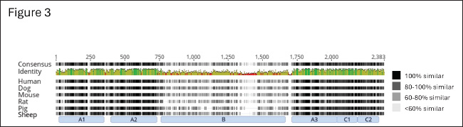 Fig. 3. Amino acid alignment of full-length factor VIII among humans and hemophilia A animal models. The alignment of full-length coagulation factor VIII of Homo sapiens (gi 182383), Canis lupus familiaris (gi 2645493), Mus musculus (gi 148697282), Rattus norvegicus (gi 34328534), Sus scrofa (gi 47523422), and Ovis aries (gi 284484541) obtained from NCBI and UniProt (The UniProt Consortium, 2022). Shading indicates the level of homology, with 100% homology being black and less homology being progressively lighter. Domain structure shown below with lack of inter-species homology throughout the B-domain of factor VIII. ConclusionHere we have demonstrated that the conservation of H1645 within the furin cleavage site of canine FVIII is common to multiple breeds of dogs (C. lupus familiaris), their direct ancestor the gray wolf (C. lupus), and the closely related coyote (C. latrans), but not other members of the order Carnivora, suggesting this unique canid sequence evolved in a common ancestor under distinct evolutionary pressure from the high conserved R1645 variant seen in many other mammalian species. AcknowledgmentsWe are grateful for the critical collaborators that kindly provided animal samples: Dr. Carolin Humpal and Dr. Michelle Carstensen from Minnesota Department of Natural Resources (gray wolf carcasses), Dr. Linda Rutledge from Trent University and Dr. Bradley White from Natural Resources DNA Profiling and Forensic Center at Trent University, Ontario, Canada (Eastern coyotes), Dr. Mary Beth Callan, University of Pennsylvania (domestic dogs) and Dr. Laura R. Prugh, University of Washington (coyote samples from Washington and Alaska), and numerous U.S. Geological Survey volunteer field technicians that collected data and samples. We would also like to thank Nicolas Martin, Charlotte M. Guerra, and Taylor Daniel for technical assistance. We thank Ellen Heilhecker (Washington Department of Fish and Wildlife) and Bhavya Doshi for their helpful reviews of our manuscript. Any mention of trade, product, or firm names is for descriptive purposes only and does not imply endorsement by the U.S. Government. FundingVRA reported receiving NIH/NHLBI funding, R01 HL137335 (VRA), P01-HL139420 (Project 4 to VRA). Authorship contributionJMC and JIS performed the molecular studies, analyzed and assembled the data, and wrote the manuscript; SB-M and LDM provided guidance, samples from wild gray wolves, and wrote the manuscript; fieldwork and initial manuscript drafting were done while SB-M was with USGS; BSJ analyzed and assembled the data and wrote the manuscript; VRA designed the experiments, supervised the work, analyzed the data, and drafted the manuscript, but passed away prior to completion of the manuscript. Conflict of interestThe authors declare that there is no conflict of interest. Data availabilityThe dataset is deposited into Dryad (DOI: 10.5061/dryad.t76hdr8b5). ReferencesAltschul, S.F., Gish, W., Miller, W., Myers, E.W. and Lipman, D.J. 1990. Basic local alignment search tool. J. Mol. Biol. 215, 403–410. Barber-Meyer, S.M. 2021. The importance of wilderness to wolf (Canis lupus) survival and cause-specific mortality over 50 years. Biol. Conserv. 258, 109–145. Barber-Meyer, S.M. and Mech, L.. D. 2014. How hot is too hot? Live-trapped gray wolf rectal temperatures and 1-year survival. Wildl. Soc. Bull. 38, 762–772. Bashir, A., Li, S., Ye, Y., Zheng, Q., Knanghat, R., Bashir, F., Shah, N.N., Yang, D., Xue, M., Wang, H. and Zheng, C. 2024. SARS-CoV-2 S protein harbors furin cleavage site located in a short loop between antiparallel β-strand. Int. J. Biol. Macromol. 281, 136020. Bergstrom, A., Frantz, L., Schmidt, R., Ersmark, E., Lebrasseur, O., Girdland-Flink, L., Lin, A.T., Stora, J., Sjogren, K.G., Anthony, D., Antipina, E., Amiri, S., Bar-Oz, G., Bazaliiskii, V.I., Bulatovic, J., Brown, D., Carmagnini, A., Davy, T., Fedorov, S., Fiore, I., Fulton, D., Germonpre, M., Haile, J., Irving-Pease, E.K., Jamieson, A., Janssens, L., Kirillova, I., Horwitz, L.K., Kuzmanovic-Cvetkovic, J., Kuzmin, Y., Losey, R.J., Dizdar, D.L., Mashkour, M., Novak, M., Onar, V., Orton, D., Pasaric, M., Radivojevic, M., Rajkovic, D., Roberts, B., Ryan, H., Sablin, M., Shidlovskiy, F., Stojanovic, I., Tagliacozzo, A., Trantalidou, K., Ullen, I., Villaluenga, A., Wapnish, P., Dobney, K., Gotherstrom, A., Linderholm, A., Dalen, L., Pinhasi, R., Larson, G. and Skoglund, P. 2020. Origins and genetic legacy of prehistoric dogs. Science 370, 557–564. Botigue, L.R., Song, S., Scheu, A., Gopalan, S., Pendleton, A.L., Oetjens, M., Taravella, A.M., Seregely, T., Zeeb-Lanz, A., Arbogast, R.M., Bobo, D., Daly, K., Unterlander, M., Burger, J., Kidd, J.M. and Veeramah, K.R. 2017. Ancient European dog genomes reveal continuity since the Early Neolithic. Nat. Commun. 8, 16082. Cameron, C., Notley, C., Hoyle, S., Mcglynn, L., Hough, C., Kamisue, S., Giles, A. and Lillicrap, D. 1998. The canine factor VIII cDNA and 5’ flanking sequence. Thromb. Haemost. 79, 317–322. Elder, B., Lakich, D. and Gitschier, J. 1993. Sequence of the murine factor VIII cDNA. Genomics 16, 374–379. Gitschier, J., Wood, W.I., Goralka, T.M., Wion, K.L., Chen, E.Y., Eaton, D.H., Vehar, G.A., Capon, D.J. and Lawn, R.M. 1984. Characterization of the human factor VIII gene. Nature 312, 326–330. Gopalakrishnan, S., Sinding, M.S., Ramos-Madrigal, J., Niemann, J., Samaniego Castruita, J.A., Vieira, F.G., Caroe, C., Montero, M.M., Kuderna, L., Serres, A., Gonzalez-Basallote, V.M., Liu, Y.H., Wang, G.D., Marques-Bonet, T., Mirarab, S., Fernandes, C., Gaubert, P., Koepfli, K.P., Budd, J., Rueness, E.K., Sillero, C., Heide-Jorgensen, M.P., Petersen, B., Sicheritz-Ponten, T., Bachmann, L., Wiig, O., Hansen, A.J. and Gilbert, M.T.P. 2018. Interspecific gene flow shaped the evolution of the genus Canis. Curr. Biol. 28, 3441–3449.e5. Healey, J.F., Lubin, I.M. and Lollar, P. 1996. The cDNA and derived amino acid sequence of porcine factor VIII. Blood 88, 42