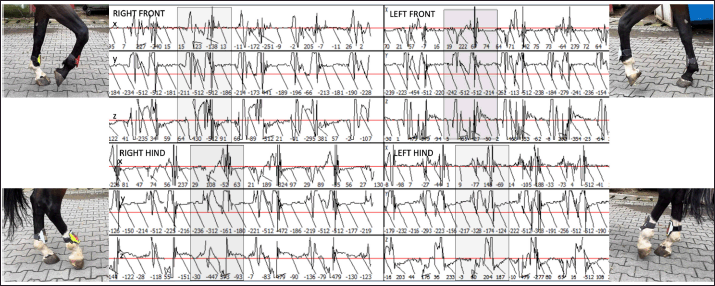 Fig. 2. Sample of the data collected using the Lameness detector 0.1 and processed with the Arduino software. Shaded areas mark the extent of one step. During the objective lameness assessment with the Lameness detector 0.1 device, all the impulses transmitted by the sensors for each of the three axes (X, Y, and Z) have been recorded. Both the subjective lameness assessment and the qualitative gait assessment using the Lameness detector 0.1 device were performed twice: first at baseline, and a second time later in the orthopedic examination, following flexion tests and at 8 minutes after the intra-articular anesthesia. The diagnostic protocol continued with radiographs, ultrasonographic investigation, and finally the diagnostic and treatment, by arthroscopy. The statistical analysis of the data included the calculation of descriptive statistical parameters (mean and median values for the number of impulses on each axis, as well as the standard deviation of the mean) on Microsoft Excel spreadsheets. All values were included, without the exclusion of outliers. The obtained values have been compared for each of the three axes between the two assessments (before and after the intra-articular anesthesia), taking into account the initial AAEP lameness score (at baseline, before the joint block). For data comparison, the paired samples t-test (Raspa et al., 2022a,b) was used, after testing the normality distribution by the Kolmogorov-Smirnov test (Spadari et al., 2023). To verify the existence of correlations, Spearman’s rank correlation coefficients (for non-parametric data) have been calculated. The level of statistical significance was set at p < 0.05. The more complex statistical analyses were carried out using the SPSS (version 17, 2010, www.spss.com) statistical software. All procedures had been performed as part of consecrated treatment protocols, with the informed consent of the animals’ owners and at pre-established costs. All horse owners have signed the mandatory informed consent documents. Ethical approval (No. 12/2014) was granted by the Bioethics Commitee of the University of Agricultural Sciences and Veterinary Medicine Cluj-Napoca (Romania). Results and DiscussionThe study population included 42 horses. Besides 10 horses without registered pedigree, the sample comprised the following breeds: Hungarian sport horse (n=13), Oldenburg (n=6), Trotter (n=5), Holsteiner (n=2), Friesian (n=2), Andalusian (n=1), Dutch warmblood (n=1), Thoroughbred (n=1), and Romanian sport horse (n=1). The mean age of the studied animals was 9 years (ranging from 4 to 14 years) with the highest number of horses in the 6-years-old age group (n=8), and six animals in each of the 7-, 8-, and 9-years-old groups, respectively. Out of the 42 horses, 20 were mares and 8of the 22 stallions were gelded. According to the consecrated AAEP lameness scale, all the horses were found to be lame in at least one hindleg in the classical visual lameness assessment, with scores ranging from 1/5 to 4/5 (AAEP lameness scale). Out of the 42 animals, 8 were lame in their right hindleg, 9 in their left hindleg, and 25 were lame in both their hindlegs. The lameness scores before intra-articular anesthesia are presented in Table 1. Before the intra-articular anesthesia, a lameness score of 4/5 (the most severe grade detected in our study) was recorded for 2/42 (4.76%) of the studied horses in their right hindlegs, and for 4/42 (9.52%) had a 4/5 lameness score in their left hindleg. After the joint blocks, no horses exhibited 4/5 lameness, but the percentage of horses with a mild lameness score (1/5) increased: from 4/42 (9.52%) at baseline to 24/42 (57.14%) after intra-articular anesthesia. These results suggest that in many cases, the lameness decreased in intensity following the joint block but did not disappear completely, as demonstrated by the percentual increase of the lower lameness scores. Table 1. Lameness scores (according to AAEP guidelines) before intra-articular anesthesia in the 42 studied horses suffering from hock OCD.
