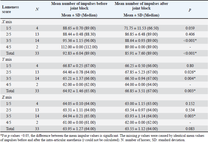 In order to explore the relationship between the mean number of impulses recorded by the Lameness detector 0.1 and the AAEP lameness score of the studied horses, correlations were calculated for each hindleg, before and after performing the intra-articular anesthesia of the tarsal joint (Table 6). Table 5. Comparisons of the mean values of the impulses recorded by the Lameness detector 0.1 on its three axes according to the lame hindleg of the assessed horses, regardless of their lameness scores, before and after intra-articular anesthesia.