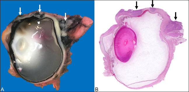 Fig. 1. Ocular squamous cell carcinoma from a 17-year-old Holstein cow with a concurrent perineal squamous cell carcinoma. (A): Photograph of a cross-section of the left eye after exenteration and formalin fixation. The poorly demarcated masses (white arrowheads) multifocally invaded corneoscleral junction, sclera, and retrobulbar skeletal muscle and soft tissues. (B): Photomicrograph of the same section shows the poorly demarcated masses (black arrows) on HandE stain. The largest perineal mass later became ulcerated and was excised (Fig. 3A) approximately 7 months after the left eye exenteration and submitted in 10% neutral buffered formalin and processed routinely for histopathological evaluations. Microscopic evaluation of the mass revealed islands and cords of well-differentiated neoplastic epithelial cells invading the dermis and subcutis. Within the neoplasm, abundant lamellated eosinophilic material was multifocally surrounded by concentric layers of epithelial cells, representing the formation of distinct keratin “pearls” associated with well-differentiated squamous cell carcinoma (SCC) (Fig. 3B). Approximately 12 months after the exenteration, the animal was presented again for copious green discharge with a putrid odor exuding from the left nostril, blocking airflow, and causing tachypnea and dyspnea. At the time, multiple lymph nodes, including left mandibular and prescapular lymph nodes, were enlarged on palpation. A fine-needle aspiration was performed on the enlarged left prescapular lymph node. The cytological evaluation demonstrated a heterogeneous population of lymphocytes and a variable number of plasma cells and macrophages, which was interpreted as reactive lymphoid hyperplasia, though tumor metastasis could not be excluded. Due to the deterioration of the health status (decreased appetite, decreased airflow, and dyspnea with putrid nasal discharge), the advanced age of the animal, and multiple suspected comorbidities (including multiple enlarged lymph nodes with suspected tumor metastasis), euthanasia was elected.