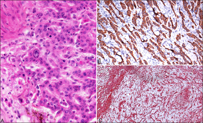 Fig. 2. Photomicrographs of an ocular squamous cell carcinoma from a 17-year-old Holstein cow with a concurrent perineal squamous cell carcinoma. (A): Neoplastic cells within sclera of the left eye were anaplastic and pleomorphic (HE). (B): Immunohistochemistry for pancytokeratin on the ocular neoplasm shows strong immunolabeling of the epithelial component of the neoplasm (IHC) (C): Immunohistochemistry for vimentin shows immunolabeling only of the intervening stromal component surrounding the pancytokeratin-positive cords of infiltrative neoplasm, consistent with a desmoplastic response to the neoplasm (IHC).