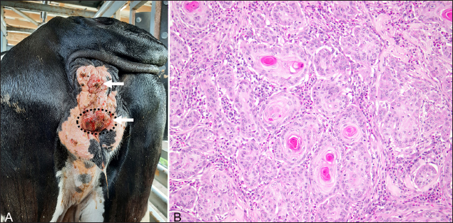 Fig. 3. Perineal squamous cell carcinoma (white arrows) from a 17-year-old Holstein cow with a previously diagnosed ocular squamous cell carcinoma. (A): Photograph of the perineal masses. The ulcerated mass (dash-line circle) was surgically excised and submitted for histopathology. (B): Histopathology revealed poorly demarcated infiltrated neoplasm composed of polygonal cells arranged in cords, trabeculae, and islands. There was moderate parakeratotic and orthokeratotic hyperkeratosis, formation of keratin ‘pearls’, consistent with a well-differentiated squamous cell carcinoma (HE). On postmortem examination, the cow was well-conditioned with a body condition score of 4/5 and weighed approximately 700 kg. The left nasal cavity contained dark green, malodorous purulent material, and the mucosa of the left maxillary sinus was expanded by an irregular, dark red, firm, ulcerated mass partially covered by fibrin strands. The perineum contained large, firm, multifocal, dark-red irregular masses, up to 2-cm in diameter. Multiple lymph nodes, including mandibular, prescapular, inguinal, and medial iliac, appeared firm and enlarged on palpation, and contained multifocal white nodules on cross sections. Tissue sections were collected from left maxillary sinus, lymph nodes (mandibular, prescapular, medial iliac, and inguinal), and representative visceral organs were fixed in neutral-buffered 10% formalin and processed routinely for histological examinations. On microscopic evaluation, the ulcerative mass from the left maxillary sinus was an infiltrative neoplasm that shared similar histological features to the ocular neoplasm, and there were multifocal areas of bone remodeling, mucosa necrosis and ulceration with neutrophilic inflammation and numerous coccobacilli. Anaerobic culture of the purulent material collected from the left maxillary sinus demonstrated the growth of Trueperella pyogenes. The lymph nodes collected contained abundant subcapsular macrophages and plasma cells and multifocal areas of hemorrhages in both the subcapsular space and medulla. No evidence of lymphatic or lymphovascular invasion of neoplastic cells was observed in the sections collected. The final diagnoses were ocular SCC with invasion to the left maxillary sinus, secondary necro-ulcerative sinusitis, and perineal SCC. DiscussionIn the present case, the animal was an approximately 17-year-old Holstein cow diagnosed with ocular and perineal SCCs, treated with exenteration of the affected eye, and survived for more than 12 months after the diagnosis. The animal lived on a tropical island and had dark pigmentation around the affected left eye and lacked pigmentation around the perineum. This cow possessed multiple risk factors for developing SCC, including advanced age, prolonged and intense solar exposure, and perineal hypopigmentation. Due to the presence of SCCs at two distant locations, metastasis or a common virus-induced origin was initially suspected. It has been reported that SCC in the eyelids shows a higher frequency of metastases than tumors of the cornea and limbus (Tsujita and Plummer, 2010). In this case, metastasis was not detected, and enlarged regional lymph nodes were found to be reactive with no evidence of tumor cells. Previous studies (Dmochowski 1967; Epstein 1972; Ford et al., 1982; Anson et al. 1982; Rutten et al., 1992) suggested the involvement of bovine papillomaviruses (BPV) and bovine herpesviruses (BHV) in the initial neoplastic transformation of bovine ocular and genital SCCs, and not necessarily the tumor maintenance. In women, human papillomaviruses (HPVs) are found to cause cervical cancer (Bosch et al., 2002) and are strongly associated with vaginal SCC (Fuste et al., 2010). In contrast, malignant transformation in bovine due to BPVs are traditionally associated with urinary bladder and upper alimentary neoplasia (Borzacchiello et al., 2003; Munday, 2014). Several herpesviruses have also demonstrated association with urogenital carcinoma in their natural hosts, such as human and sea lions (Kaufman et al., 1981; Gulland et al., 2020). To further investigate the possibility of a viral etiology in the present case, glass slides containing tissues from ocular and perineal masses were submitted to the University of Guelph Animal Health Laboratory for detection of BPVs, and the nuclear immunolabeling was negative in both sections. However, negative immunolabeling of BPVs could not rule out the possibility of BPV’s involvement. Although IHC is a useful method for detecting viral antigens in fixed tissues, false negatives can occur due to sampling. Additionally, only 13 BPVs have been characterized, while over 170 types of HPVs have been fully characterized (Rector and Van Ranst, 2013; Munday, 2014). It is likely that many BPV types have not been identified. BHV could also play a role in the etiopathogenesis of bovine SCC. A previous study (Anson et al., 1982) demonstrated the detection of BHV-5 in bovine ocular SCC tumor cells and that exposing cells derived from these tumor cells to UV light and high pH media could induce viral replication and increase the number of BHV-5 viral antigens detected by indirect immunofluorescence. These results could suggest an association between BHV infection and bovine ocular SCC since chronic UV exposure has been associated with an increased incidence of bovine ocular SCC. Mutations of tumor suppressor genes, including p53 and p16, are thought to be involved in the development of human head and neck cancers, especially SCC, and the aberration of these tumor suppression genes can be caused by somatic mutations induced by UV radiation and through inactivation by viral oncogenes such as HPVs E6/E7 (Leemans et al., 2011). These tumor suppressor genes also showed prognostic potential in human medicine. Human oropharyngeal SCC patients with p16 expressing tumors showed significantly better outcomes than those with p16 non-expressing tumors (Sedghizadeh et al. 