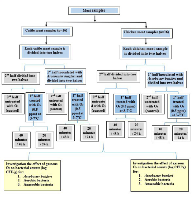 Fig. 1. A flow diagram for the study design. DiscussionResearchers have examined the effects of gaseous and liquid O3 on many microorganisms, such as viruses, protozoa, bacterial and fungal spores, and even coronaviruses, on food (Xue et al., 2023). Consumers in Iraq could be at risk of infection with A. butzleri, due to the recent detection of this bacterium in both fresh and chilled retail meat sold in the country (Jasim et al., 2021; Kanaan, 2021). Therefore, this bacterium was introduced into meat samples to evaluate the effects of O3 gas at temperatures between 3°C and 7°C over a 48-hour storage period. Table 1. Effect of O3 gas on the A. butzleri, total aerobic and anaerobic bacterial counts (log CFU/g) of inoculated chicken meat with A. butzleri during storage at 3°C–7°C.