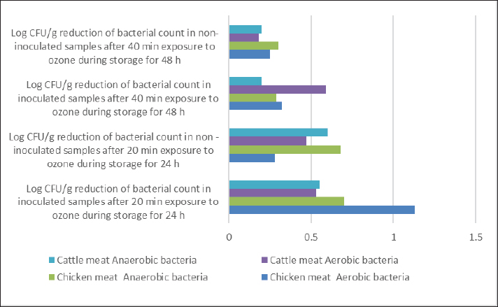 Fig. 2. Log CFU/g reduction of bacterial counts in inoculated and non-inoculated samples after exposure to gaseous O3. Megahed et al. (2020) examined the microbial eradication capacity of aqueous mixtures of O3 and lactic acid-O3 (O3-LA) under various operation settings on chicken meat infected with a high load of Salmonella. Further studies showed that aqueous O3 (8 ppm) had a lethal effect of 1.6 log/cm2 when administered topically, while it was 1.2 log/cm2 and 1 when injected subcutaneously. Based on the observation obtained by Giménez et al. (2021), it was found that increasing the O3 concentration greatly reduced the quantity of mesophilic bacteria, lactic acid bacteria, Enterobacteriaceae, molds, and yeasts. In contrast, Botta et al. (2018) found in their study that the initial bacterial count did not change when beef samples were treated with aqueous O3. According to Xue et al. (2023), the inactivation of O3 is a multiphase process that affects various cellular structures and content elements. O3 primarily affects cell membranes, as it can filter intracellular material during stress (Botta et al., 2018). Sheng et al. (2018) noted that O3 may be able to interfere with enzymes and prevent the growth and activity of bacteria. This could be the reason for the changes reported by Aponte et al. (2018), which are due to the permeability of the cell membrane. Another research showed that O3 can cleave the DNA double bond by oxidation using of a highly reactive form of O2 (O) (Botta et al., 2018). There are a variety of internal and external variables that influence O3 when applied to microbes. According to Crowe et al. (2012), Shu et al. (2021), Liu et al. (2022), and other authors, these include various different intrinsic microbiological factors such as the type of microorganisms, characteristic of food, the physiological conditions of the microbial cells, and the microorganisms that are naturally present or artificially introduced. Additionally, the intrinsic parameters of food include the type of food, surface properties, weight, and water activity (aW) (Xue et al., 2023). Brodowska et al. (2018), Chen et al. (2020), Liu et al. (2021), Bigi et al. (2021), and Onopiuk et al. (2021) have reported that the variables for O3 therapy include temperature, contact time, O3 concentration, and the application techniques were the most common stress factors. As a result, these variations may arise from differences between studies. Tables 1 and 2 demonstrate that following preservation at 3°C–7°C for an additional 24 hours, an extension of the duration of exposure to 20 minutes resulted in a greater reduction compared with the controls. Other studies also showed that with increased exposure to O3, its efficiency against bacteria becomes higher. This was evident from the works of Kanaan (2018); Chen et al. (2020); Onopiuk et al. (2021); Aslam et al. (2021); and Kanaan et al. (2024b). However, this increase in effects seems to reach an asymptote beyond which further increases are not possible to achieve, probably due to structures within food or even due to non-viable microbial cells assumed to protect against the oxidative action of O3 (Ayranci et al., 2020). The result also showed that the bacterial inhibition rate was significantly lower when an additional day of cooling was applied. Such an effect seems to be related to the limitations of O3 exposure, as the O3 exposure could only remove superficial bacterial contamination. Tables 3 and 4, and Figure 2 confirm that, with time, the counts of total aerobic and anaerobic bacteria were lower in the case of inoculated samples than in the case of non-inoculated samples. Furthermore, the study demonstrated that exposure to O3 could in some way inhibit or retard the germs’ growth in a cold environment. According to this perspective, O3 treatment acts as an antimicrobial agent for meat products kept or stored at a cold temperature to eliminate surface bacterial infection. Cárdenas et al. (2011) previously studied the application of gaseous O3 treatment on bacterial counts on meats. Total and E. coli bacterial counts decreased by 0.5 log to attain 0 log, while the count of L. monocytogenes, injected at 102 CFU/g tissue under cold storage conditions, fell below the limit of detection. Another study conducted by Muhlisin et al. (2016) discovered that gaseous O3 applied to the beef samples did not destroy the internal form of E. coli O157:H7, but only eliminated the external contamination by this bacterium. A further piece of data supporting the effectiveness of O3 treatment during immersion chilling in improving the microbiological protection of beef comes from the finding of Kalchayanand et al. (2019) found that aqueous O3 sprays cool significantly decreased the prevalence of E. coli O157:H7 on raw beef surfaces by 1.46 log. Studies that have used O3 to reduce bacterial contamination in meat have generally shown that the surface area of ozonated meat is the primary target of O3’s antibacterial activity. The most frequent and common cause of contamination in meat is surface contamination from pathogenic microorganisms. This is an alarming situation for both health and food safety. In addition to that, O3 has been suggested as a more appropriate antibacterial agent that can improve the shelf life of meat and meat products stored in the refrigerator. ConclusionFrom this investigation, it was found that gaseous O3 of 0.5 ppm was effective in inhibiting the growth of A. butzleri in meat samples infected with A. butzleri for the first and second days of storage. In addition, gaseous O3 caused a significant reduction of bacterial populations including both aerobic and anaerobic bacteria, and greater efficacy was demonstrated for the treatment as the time of the exposure period at the same dosage was increased. In terms of public health, these results are important. The cost-effective and effective antibacterial O3-preserving treatments for food products