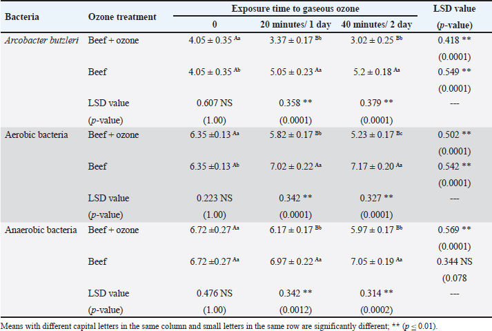 Table 4. Effect of O3 gas on the total aerobic and anaerobic bacteria counts (log CFU/g) of non-inoculated cattle meat with A. butzleri during storage at 3°C–7°C.