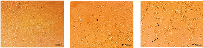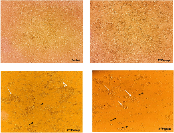 Fig. 3. The ECF cells were subjected to CPV, resulting in CPEs. The control cell monolayer remained unaffected. However, at the first passage, the cell monolayer exhibited cell rounding (White arrow) after 3 days of inoculation. Furthermore, at the second passage, the cell monolayer displayed both cell rounding and detachment (Black arrow) after 2 days of inoculation.