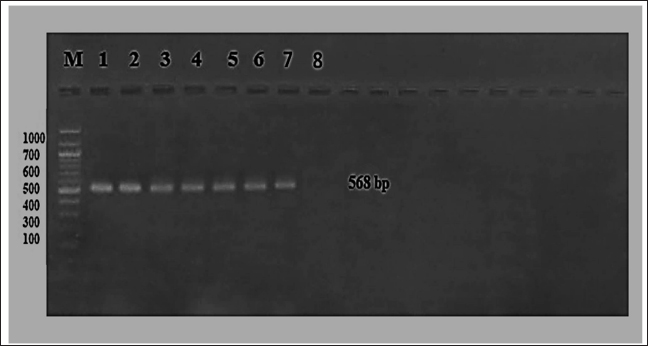 Fig. 4. The product of isolated virus was electrophoresis on 1.5% agarose at 5 volt/cm2. 1× TBE buffer for 1:30 hours. M: DNA ladder (100), 1–6 lines (isolated virus), 7 and 8 lines (positive and negative control). DiscussionThis research aimed to evaluate probable instances of CPV among individuals aged 2–6 months, including several breeds. A total of 60 fecal swabs were subjected to analysis using the rapid CPV Ag Test Kit, resulting in the identification of 30 positive samples, i.e., the positive samples about 50%. This test is widely used as a field diagnostic technique due to its expeditious nature, straight for wardens, and accessibility to both veterinarians and pet owners. Also, some studies revealed the test’s sensitivity does not surpass 50% as a result of the substantial quantity of viral antigen necessary to generate a prominent visible band. This observation corroborates the previously reported characteristics of the test, namely its high specificity and poor sensitivity, as documented by Soliman et al. (2018). The positive samples from the rapid kit were effectively cultivated on FK and ECF cells for three passages, exhibiting characteristic CPE such as cell rounding and detachment on days 2–3 and 4–6 after inoculation. These observations were made in comparison to a negative control. However, the research conducted by Sharma et al. (2016), showed that the CPV exhibited adaptation on FK cells, resulting in the manifestation of typical CPEs only after the fifth passage. Furthermore, revealed the CPE seen in the seventh passage was characterized by the shortening and rounding of cells (Sharma et al., 2016). These cuytopathic effects especially the rounding of cells may be due to the toxic effect of viral proteins but the detachment of these cells may be due to the viral replication and release of the virus from the cell to infect another cell. Also, the study of Raj et al. (2010) indicated the CPE of CPV is rounding and detached cells that are seen after 3–4 passages after infection in CRFK cell culture. CPV isolation on cell culture is a standard technique for both clinical and laboratory studies. Replicating and propagating the virus in cultured cells facilitates its research and diagnosis. Isolating CPV requires the use of canine-derived cell lines. In order to isolate CPV, FK cells are often employed as a cell line. These cells are selected because they are more likely to get infected by CPV. CPE are observable alterations brought on by a CPV infection of the cells. Examples of these impacts include cell rounding and separation from the surface of the culture flask. As well, these infected cells confirmed the presence of CPV using PCR. This assay and other virus-specific diagnostics fall within this category. But the PCR is a common molecular biology method for identifying viral infections like parvovirus because it can detect and amplify certain DNA sequences. Conventional PCR was used to amplify the six randomly chosen samples from the isolated positive samples, using specific primers targeting the Vp2 gene. All of them exhibited positivity at the 568 base pair (bp) position. This antigen was used to confirm the existence of CPV in the aforementioned samples. Also, the study of Raj et al. (2010) confirmed the isolated virus using PCR. The affirmation of the selected samples’ positive provides evidence supporting the higher sensitivity of the molecular-based technique, polymerase chain reaction, in comparison to the immunochromatographic approach, often known as the rapid test (Kurucay et al., 2023). ConclusionThe prevalence of parvovirus infection is high in Iraq. The virus was isolated in two distinct kinds of cell culture, namely primary and secondary. The isolated virus has a cytopathic impact characterized by the rounding and detaching of cells. The primary cell culture is faster than the secondary cell culture in isolation of this virus and produces a CPE. Furthermore, the presence of the isolated virus was verified by the use of a polymerase chain reaction test. AcknowledgmentsThe authors would like to express their appreciation to all members of Virology Department, College of Veterinary Medicine, University of Baghdad, for their support and help during this work. Conflict of interestThe authors declare that they have no competing interests. FundingThis research received no external funding. Authors’ contributionsAll authors contributed to this work equally. Data availabilityAll data were provided in the manuscript. ReferencesAhmed, A.I. 2020. Molecular characterization of infectious bursal disease virus isolated from naturally infected broiler chickens in Erbil, Iraq. Iraqi J. Vet. Med. 44, 21–27. Ahmed, N., Riaz, A., Zubair, Z., Saqib, M., Ijaz, S., Nawaz- Ul-Rehman, M.S., Al-Qahtani, A. and Mubin, M. 2018. Molecular analysis of partial VP-2 gene amplified from rectal swab samples of diarrheic dogs in Pakistan confirms the circulation of Canine parvovirus genetic variant CPV-2a and detects sequences of feline panleukopenia virus (FPV). Virol. J. 15(1), 45. Ali, L.F., Al-Suhail, R.G. and Naser, F.G. 2015. RT PCR detection and propagation of respiratory syncytial virus in human lung carcinoma cells (A549) cell line. Iraqi J. Vet. Sci. 56(1A), 69–74. Allawe, A.B. 2016. Molecular characterization of field isolates of avian infectious laryngeotracheitis virus from different farms in Iraq. Iraqi J. Vet. Med. 40(2), 31–35. Chen, Y., Wang, J., Bi, Z., Tan, Y., Lv, L., Zhao, H. and Qian, J. 2021. Molecular epidemiology and genetic evolution of Canine parvovirus in East China, during 2018-2020. Infect. Genet. Evol. 90, 104–780. Clark, N.J., Seddon, J.M., Kyaw-Tanner, M., Al-Alawneh, J., Harper, G., McDonagh, P. and Meers, J. 2018. Emergence of Canine parvovirus subtype 2b (CPV-2b) infections in Australian dogs. Infect. Genet. Evol. 58, 50–55. Cotmore, S.F., Agbandje-McKenna, M., Canuti, M., Chiorini, J.A., Eis-Hubinger, A.M., Hughes, J., Mietzs
