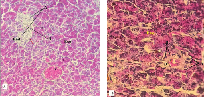 Fig. 5. Photomicroscope section of pancreas black partridge(A) and crow pancreas (B) illustrate., exocrine portion (Exo) and endocrine (Blue arrow), intralobular (I–B), duct (D), blood vessel artery (A), vein (V) (A: H & E Stain X100; B: Gomori stain X200).