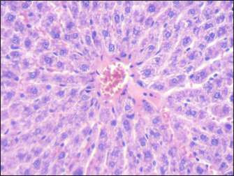 Fig. 1. Section of mouse liver from control group showing normal radiant arrangement of the hepatic cells (H and E, 400×).