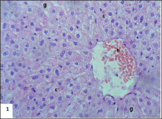 Fig. 2. Section of mouse liver fed with 1 mg/kg Lorazepam showing hemorrhage (h) and congestion (c) the cells are highly degenerated with pyknotic cells and cell ghost (g) (H and E, 400×). Effect of GABA enhancement effect by lorazepam on RAPD-PCR patternThe existence of changes in the RAPD profiles obtained from the mice genomic treated and control depended on the primer used. The seven primers produced DNA profiles that showed variations between control and treated cells, with visible changes in the number and size of DNA fragments amplified. The absence of a normal band and/or the appearance of a new band are the obvious changes caused by lorazepam treatments in the RAPD patterns. Table 3 and Figure 7 show a complete description of the RAPD-PCR profiles of the seven primers for all lorazepam treatments including several polymorphic bands and the polymorphic percent of each treated.