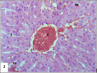 Fig. 3. Section of mouse liver fed with 2 mg/kg Lorazepam showing congestion of central vein (C), and sinusoidal dilatation (s), ballooning degeneration of some of hepatocytes, pyknotic cells, marked steatosis and congestion (cc) with some apoptotic cells (ap) (H and E, ×400).