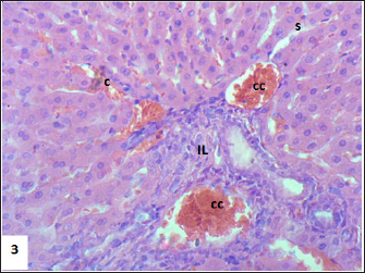 Fig. 4. Section of mouse liver fed with 1 mg/kg Lorazepam showing marked steatosis and congestion (cc) and sinusoidal dilatation (s), (b) showing infiltration (IN), degenerated cells, and congestion in sinusoids (c) (H and E, ×400). The results shown in Table 3 indicate that there are differences in the total number of bands and the number of lost and gained bands for all treatments, in addition to the difference in the polymorphic percentage between treatments of the same sample and between all samples. All of all, the used seven primers have produced a total of 432 bands for the RAPD profiles of the treated and control samples, 109 of them as a control band, 167 (loss of normal bands and appearance of new bands) as polymorphic bands, and others 156 as a homomorphic band. The samples treated with 1 and 2 mg/kg of Lorazepam displayed the highest variation in the number of polymorphic bands in RAPD analysis (60 and 59), respectively, the appearing of a new band was 41 and 40, respectively, while the disappearing of normal bands was 19 for both treatments. The polymorphisms in RAPD profiles might be due to the gain (new appearance) and/or loss (disappearance) of the amplified bands as compared to the control RAPD profile. The high value of genetic polymorphic percent (55.04%) was for 1 mg/kg treatment compared with the 3 mg/kg treatment which gave the lowest polymorphic percent (44.03%). The Lorazepam concentration (1 mg/kg) gave the highest rate of genetic polymorphism (55.04%). In contrast, this degree of genetic polymorphism was reduced to (44.03%) of the (3 mg/kg) treated. The OP A-01 gave the highest number of polymorphic bands (37), while the lowest number was for OP D-03 primer (11) bands.