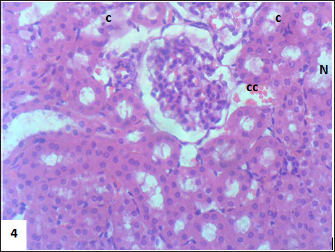 Fig. 6. Section of mouse kidney fed with 1 mg/kg Lorazepam showing congestion (cc), tubular necrosis (N), and cast (c), (H and E, ×400).